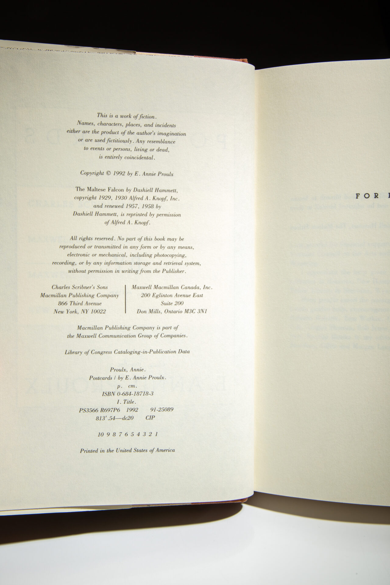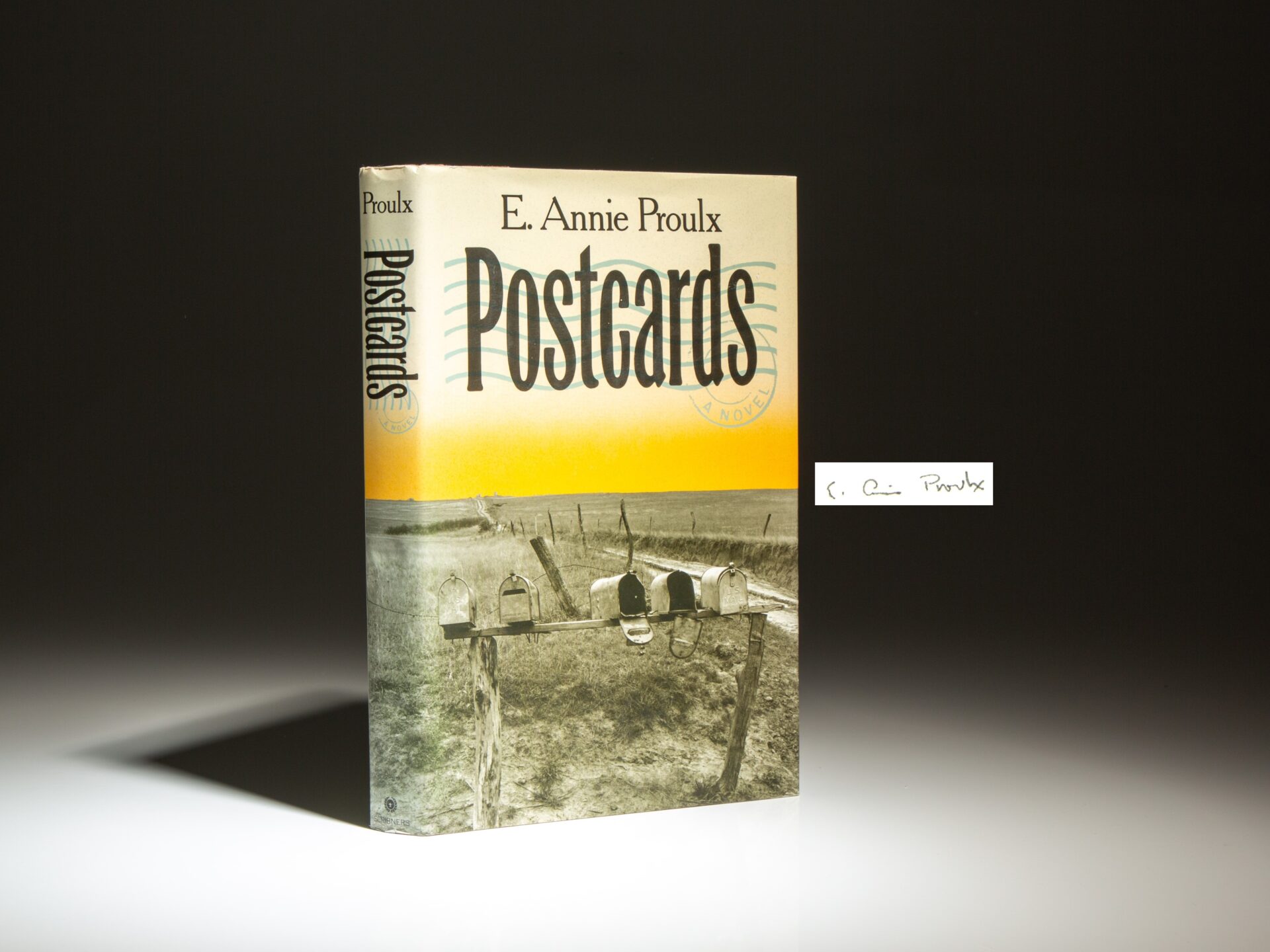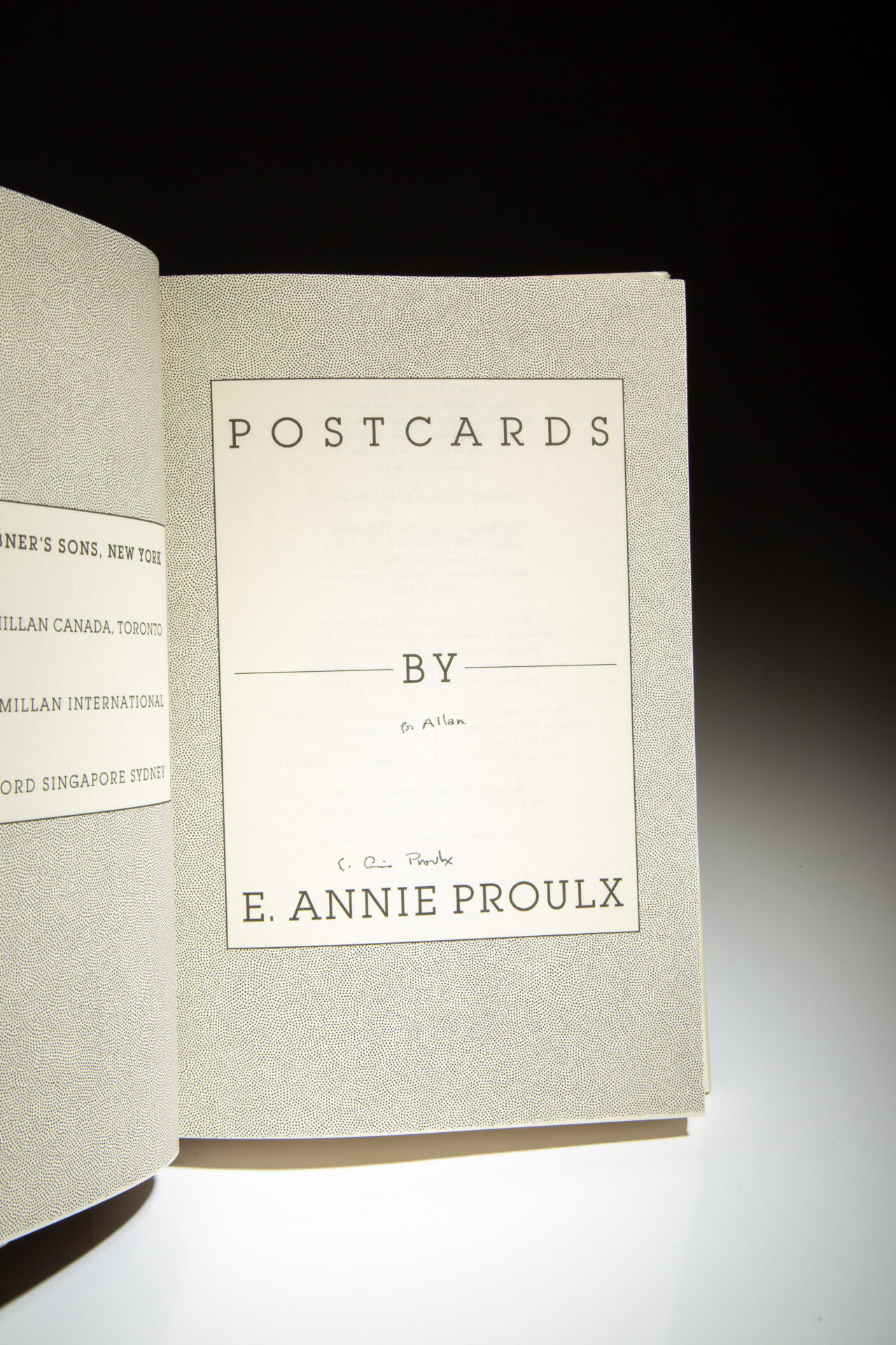 The signed first edition, first printing of Postcards by Edna Ann Proulx, winner of the Faulkner Award.