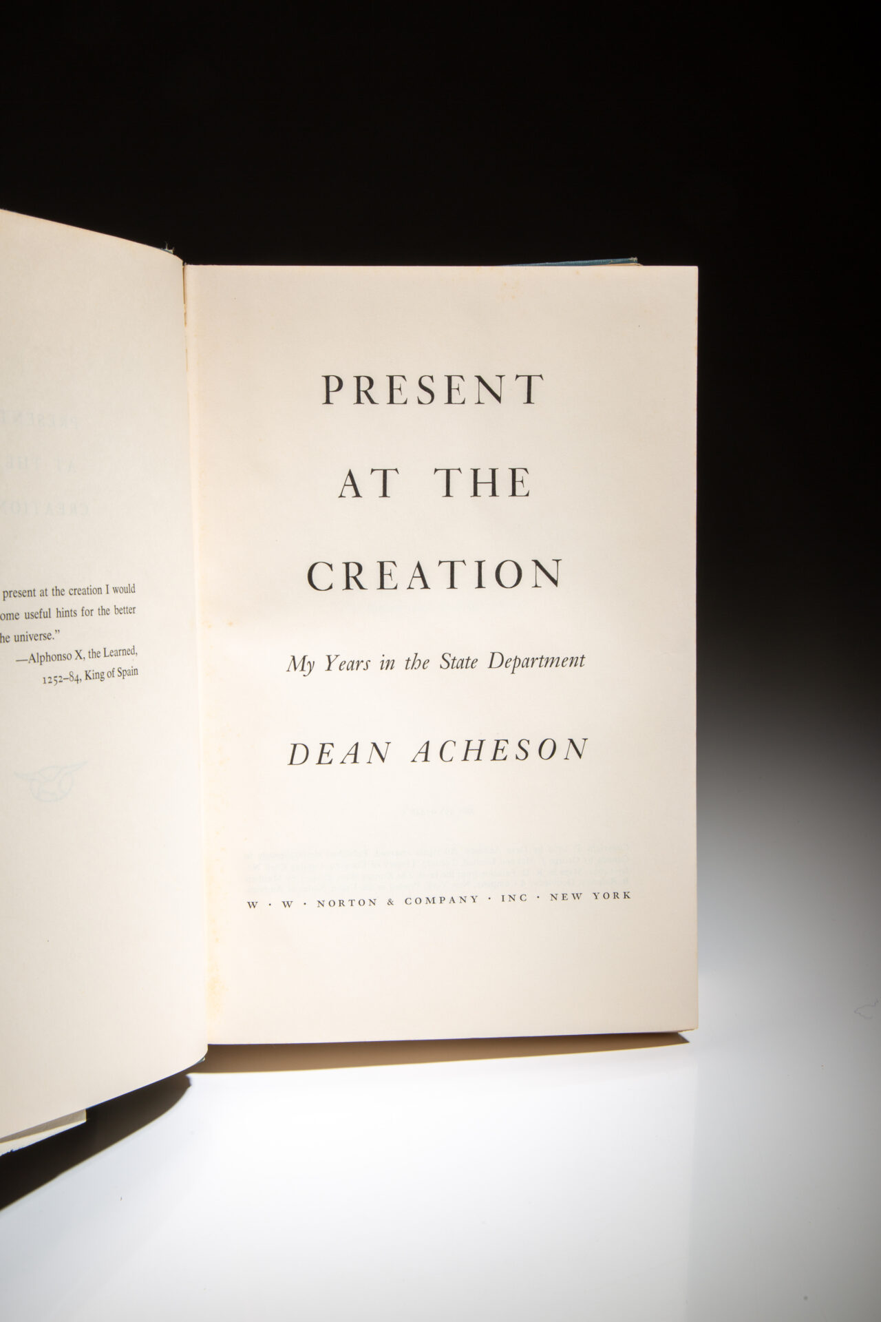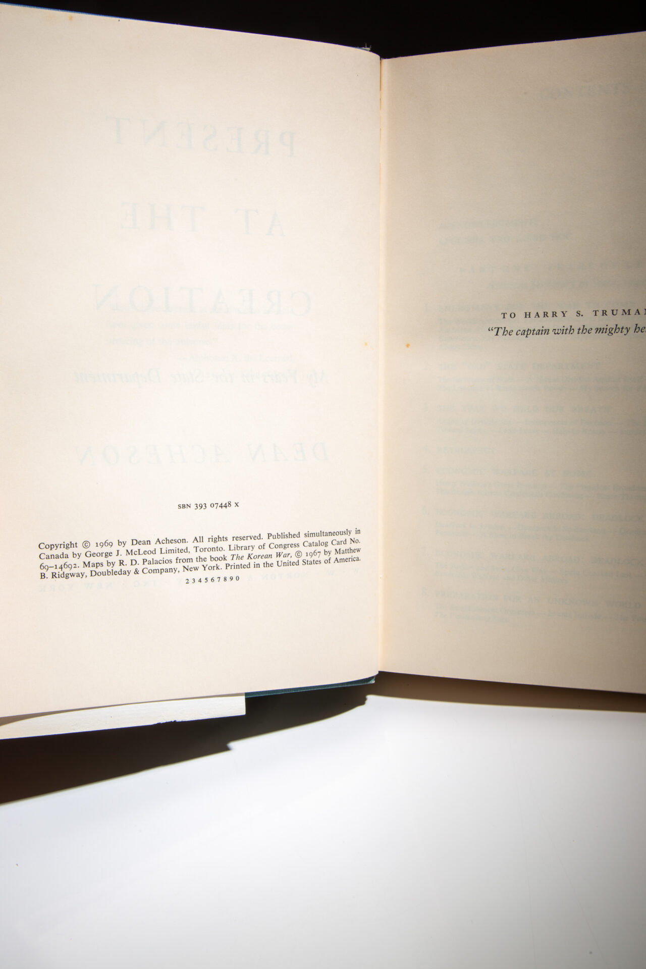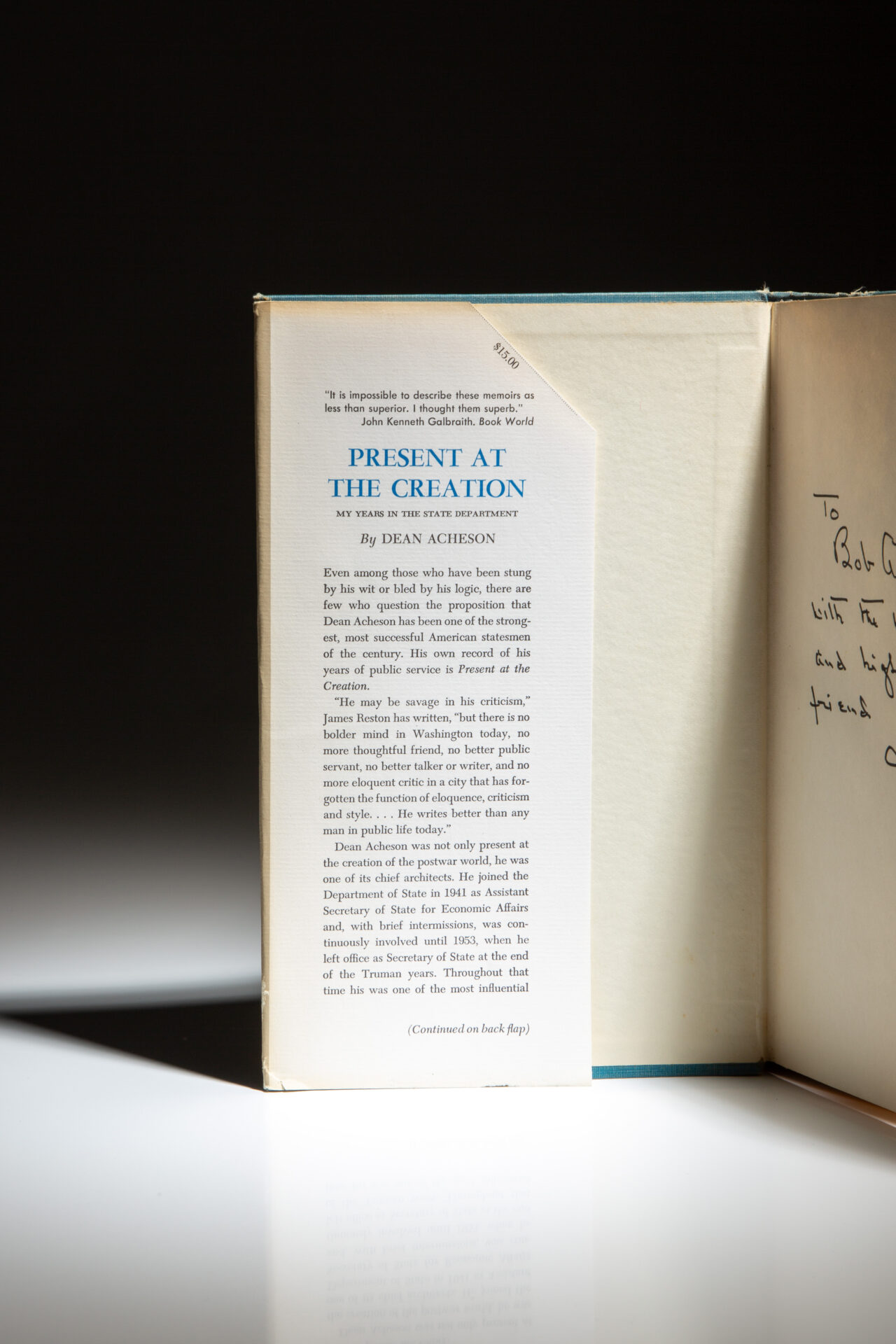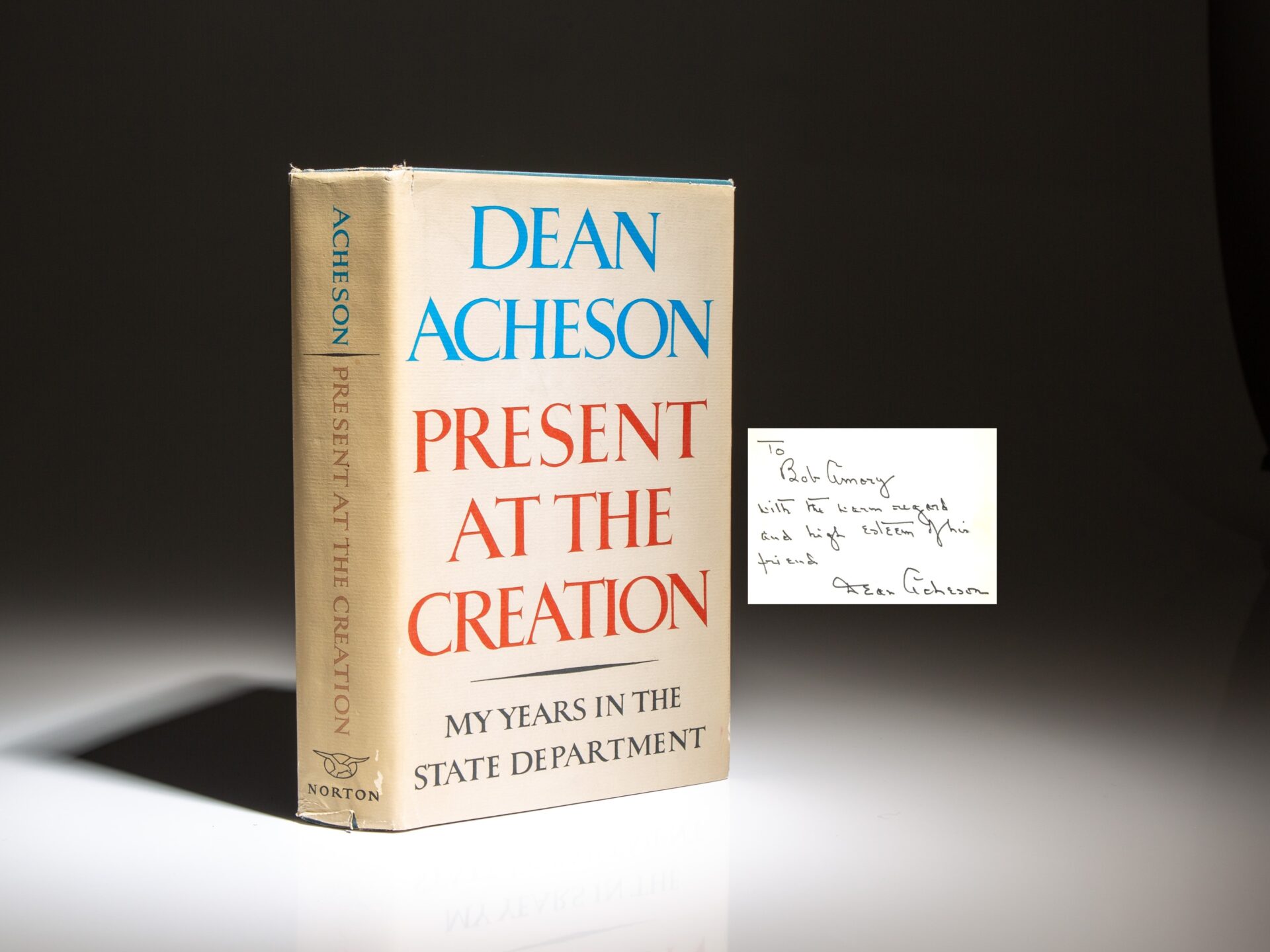 First edition of Present at the Creation, inscribed by former Secretary of State, Dean Acheson to the Deputy Director of the CIA, Robert Amory, Jr.