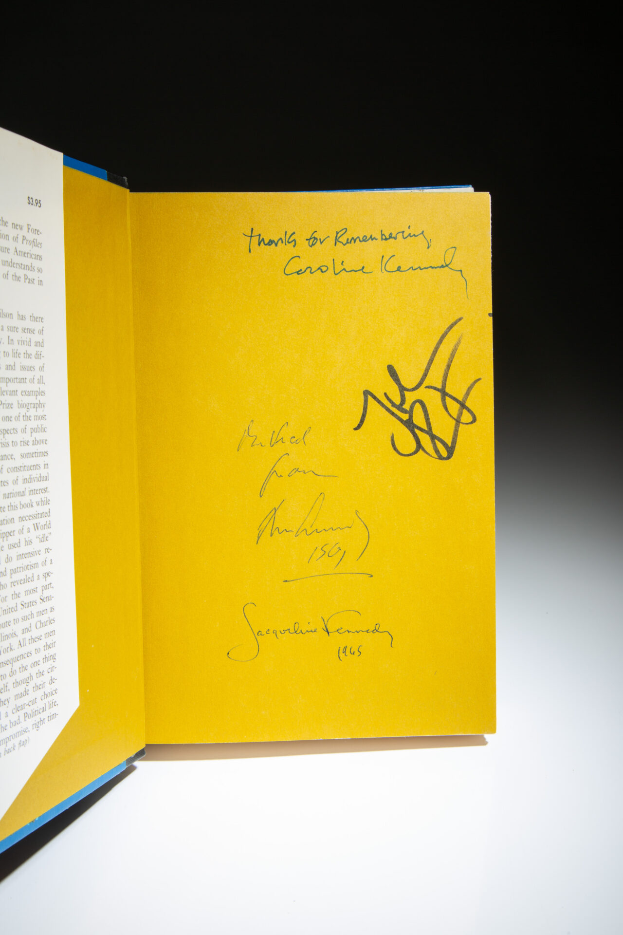 Inscribed on the front free endpaper: “_ / from John F. Kennedy / 1961.” Additionally signed by Jacqueline Kennedy (1965), John F. Kennedy Jr., and Caroline Kennedy.