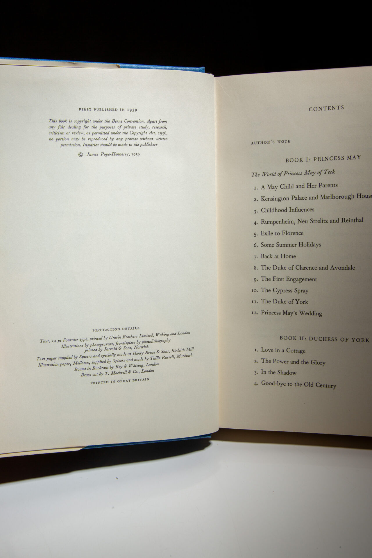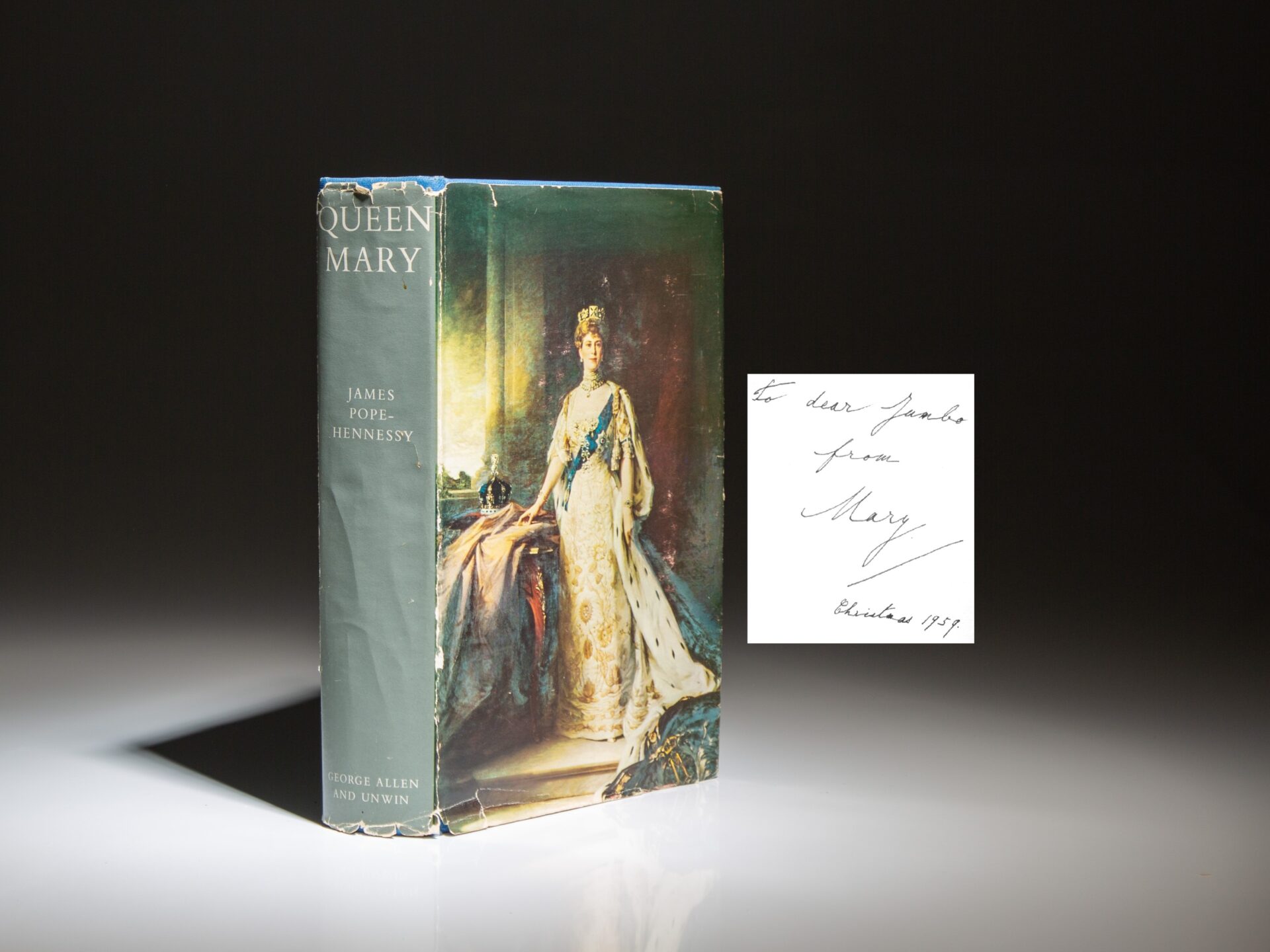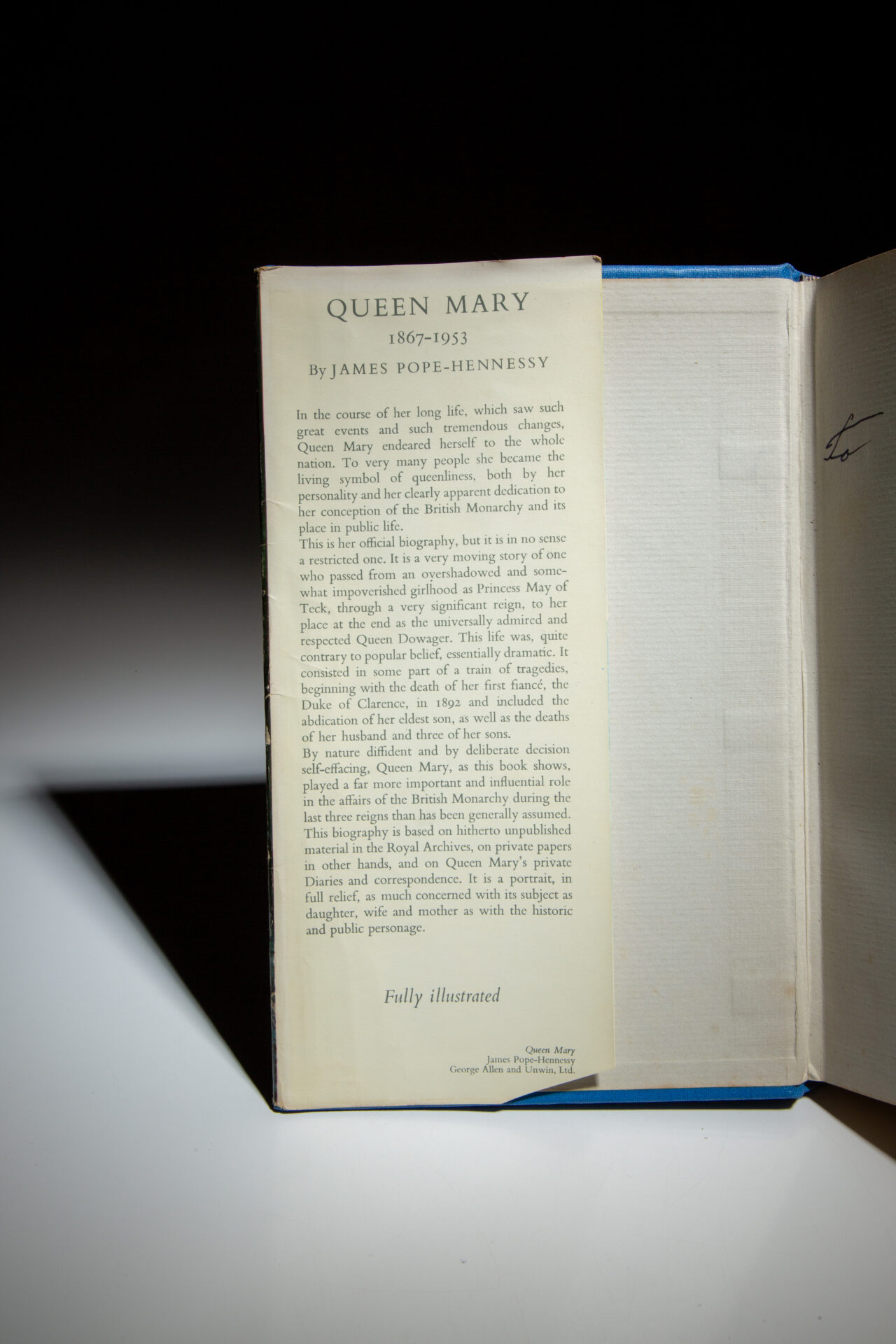 Inscribed by Mary, Princess Royal, to Major-General Rohan Delacombe, the first edition of Queen Mary 1867-1953 by James Pope-Hennessy, the biography of her mother, Queen Mary of Teck.