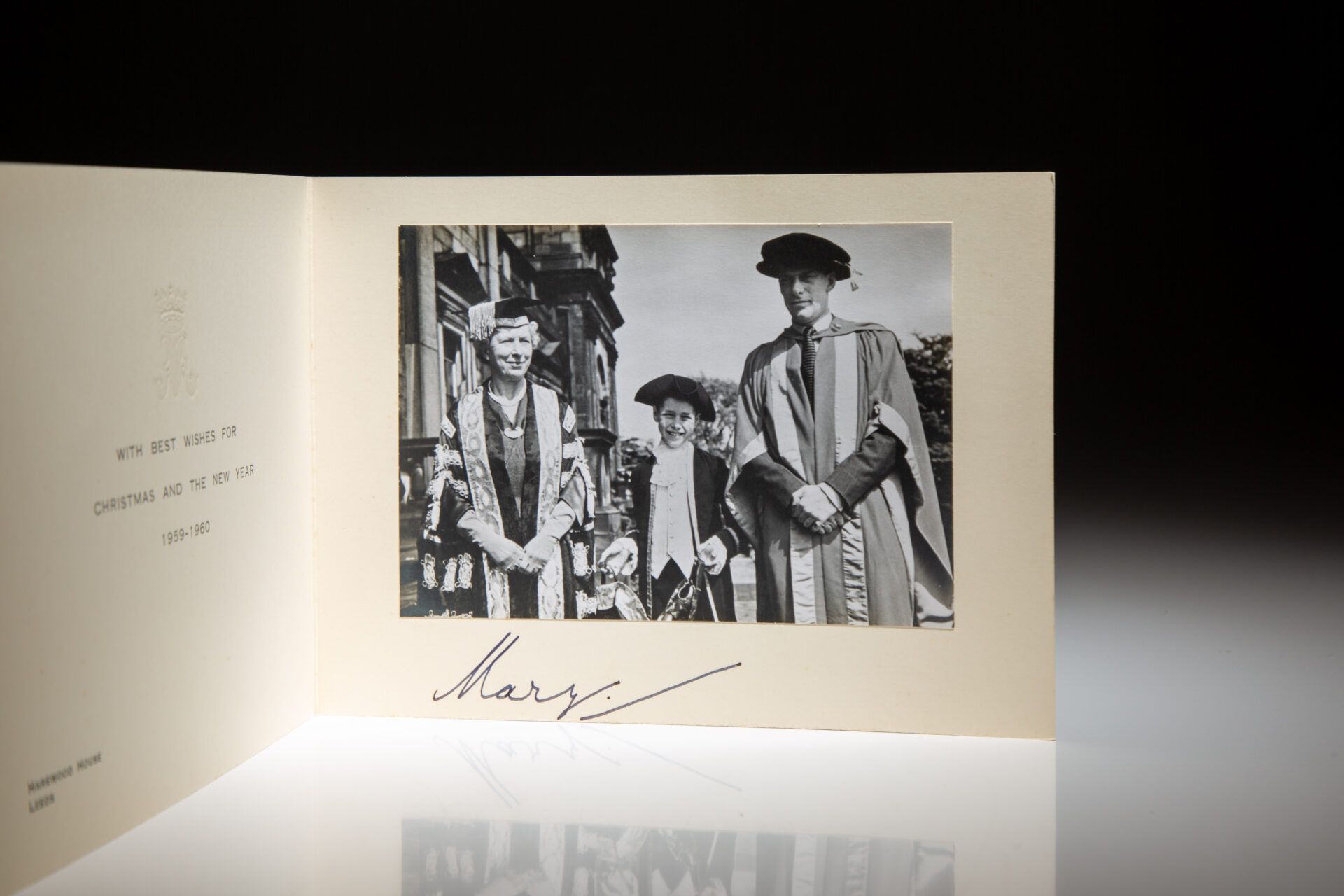 Includes a signed holiday card from 1959 on Princess Mary’s official stationery, from the Harewood House in Leeds. The envelope is addressed to Major General R. Delacombe in Berlin.