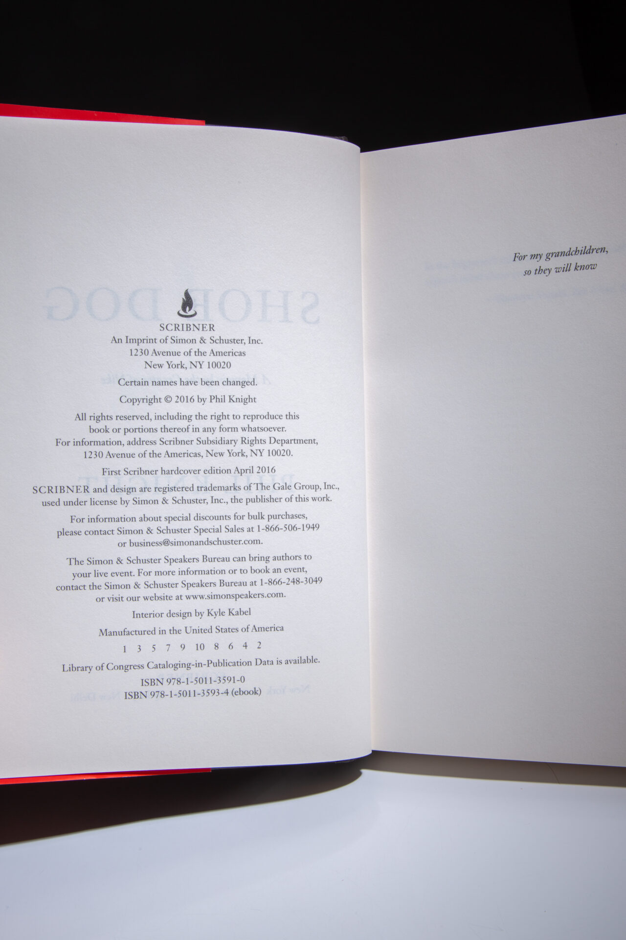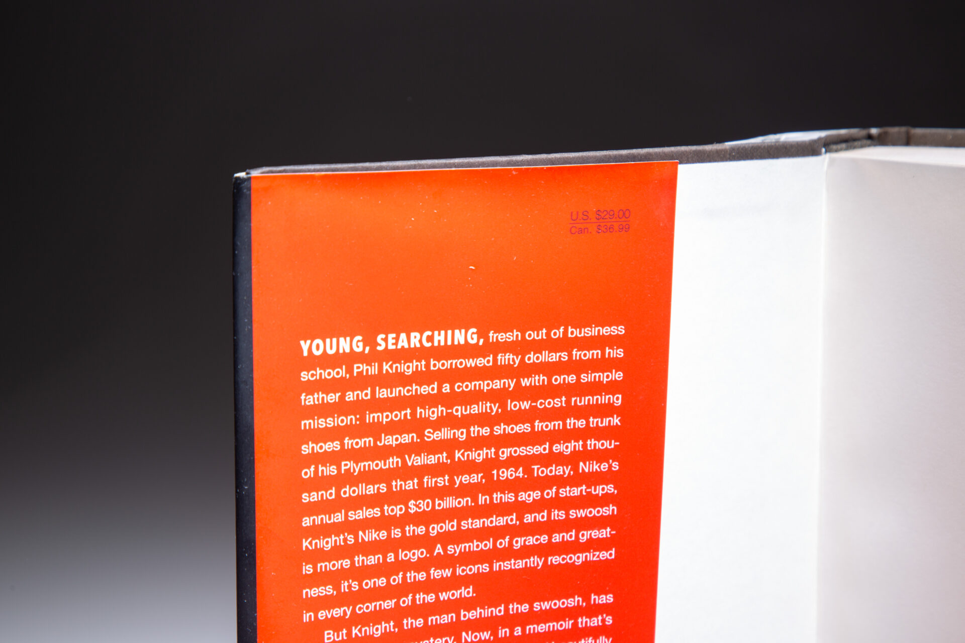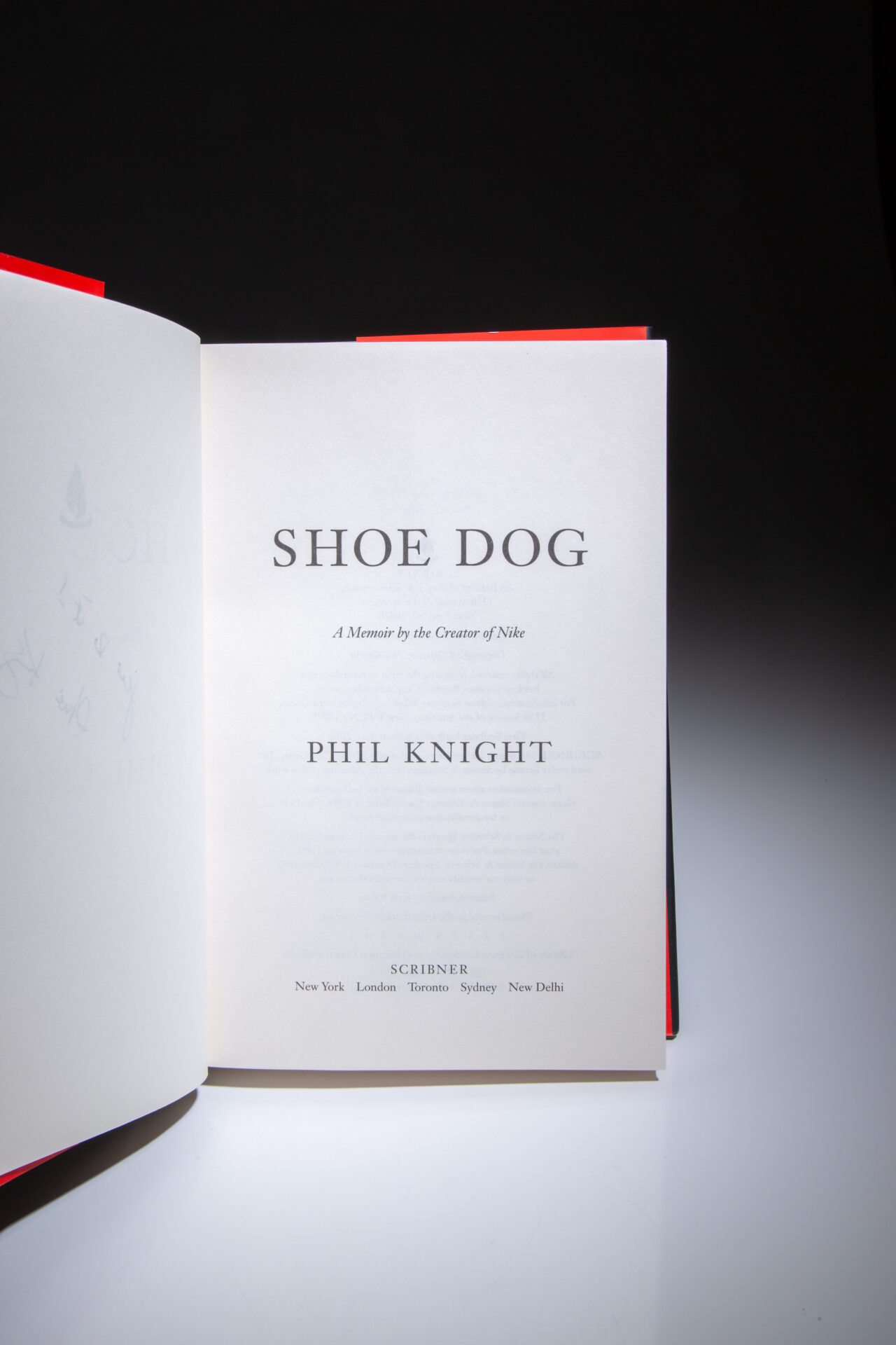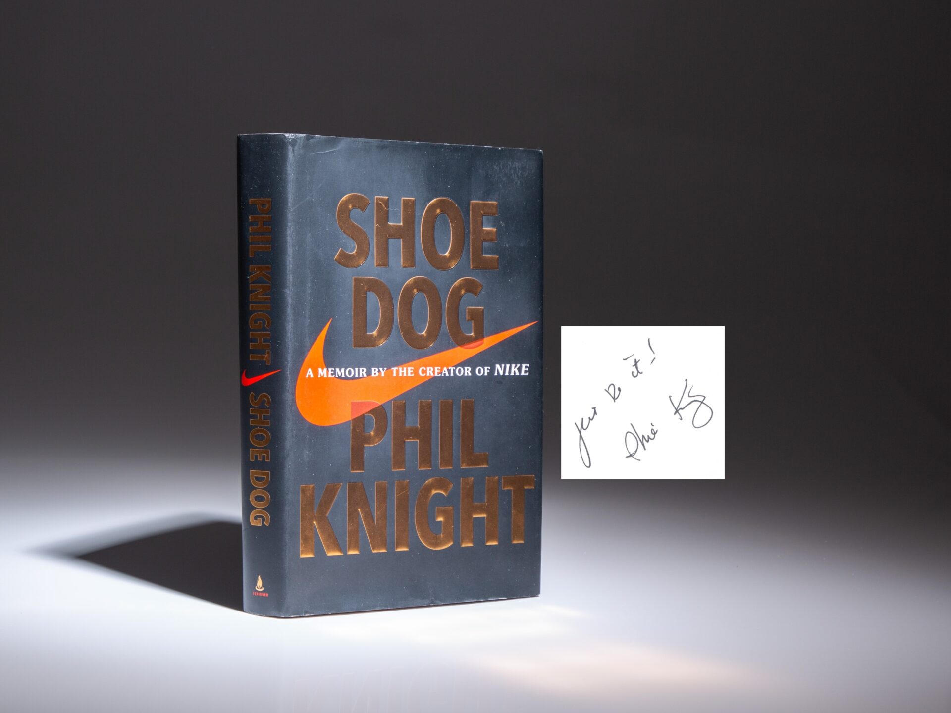 The first edition of Shoe Dog: A Memoir by the Creator of Nike, Phil Knight, inscribed “Just Do It!”