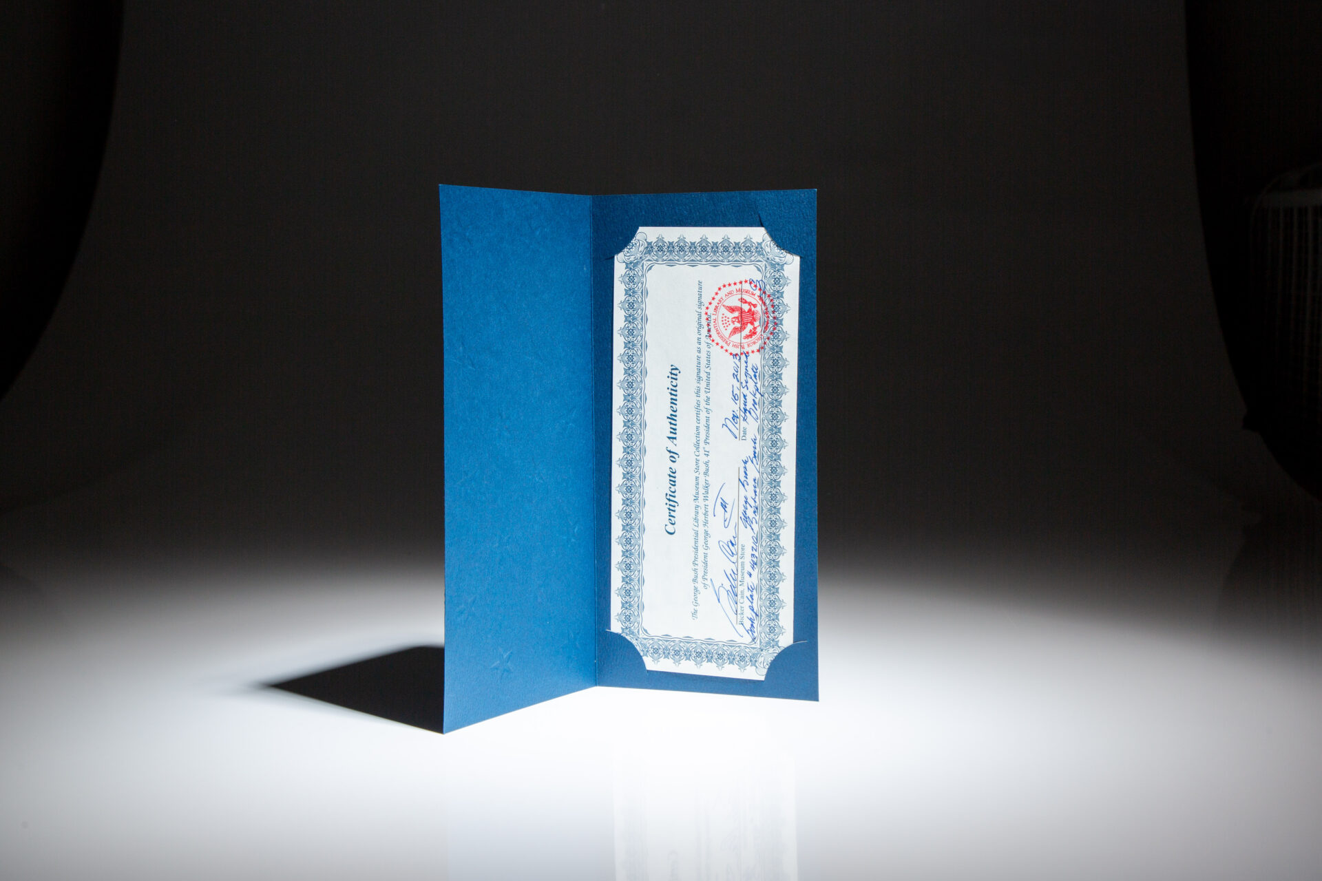Includes the certificate of authenticity from the Bush Library, dated Nov. 15, 2013. Corresponding item number (#403210) on the certificate and handwritten on the verso of the bookplate. Housed in a small folder from the library.