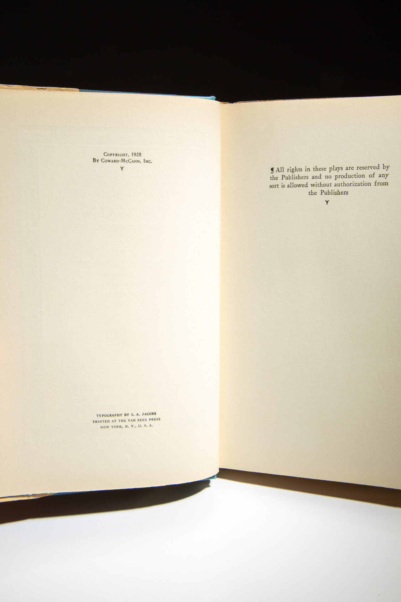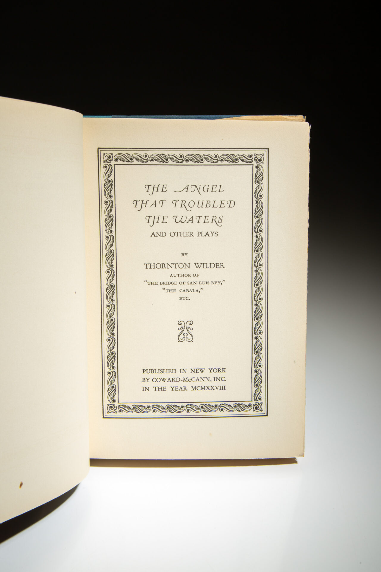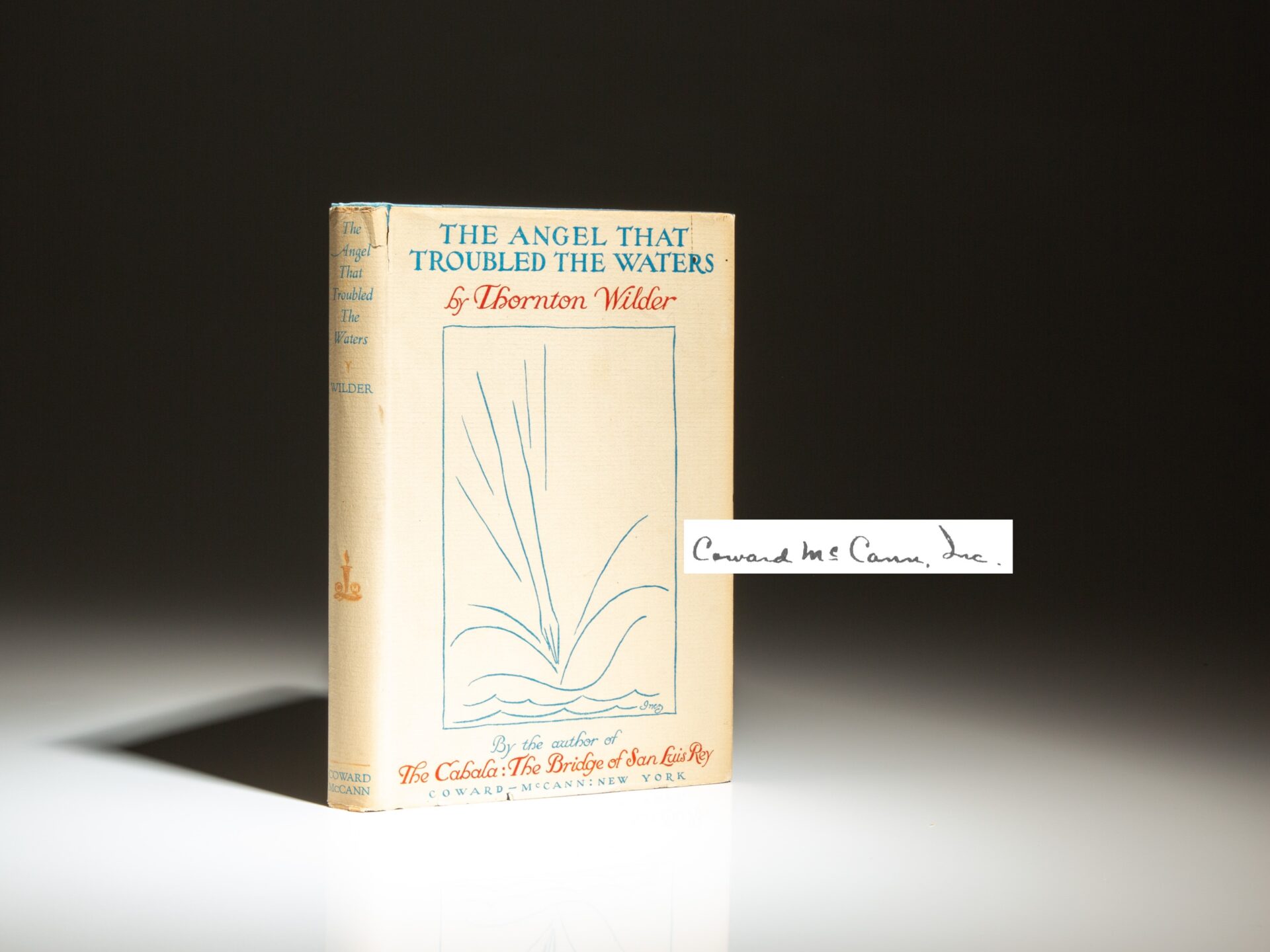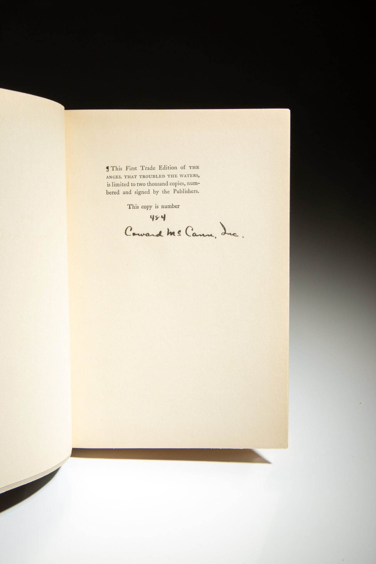 Limitation page reads: “This First Trade Edition of The Angel That Troubled the Waters, is limited to two thousand copies, numbered and signed by the Publishers.” This copy is numbered 484, and signed “Coward McCann, Inc.”