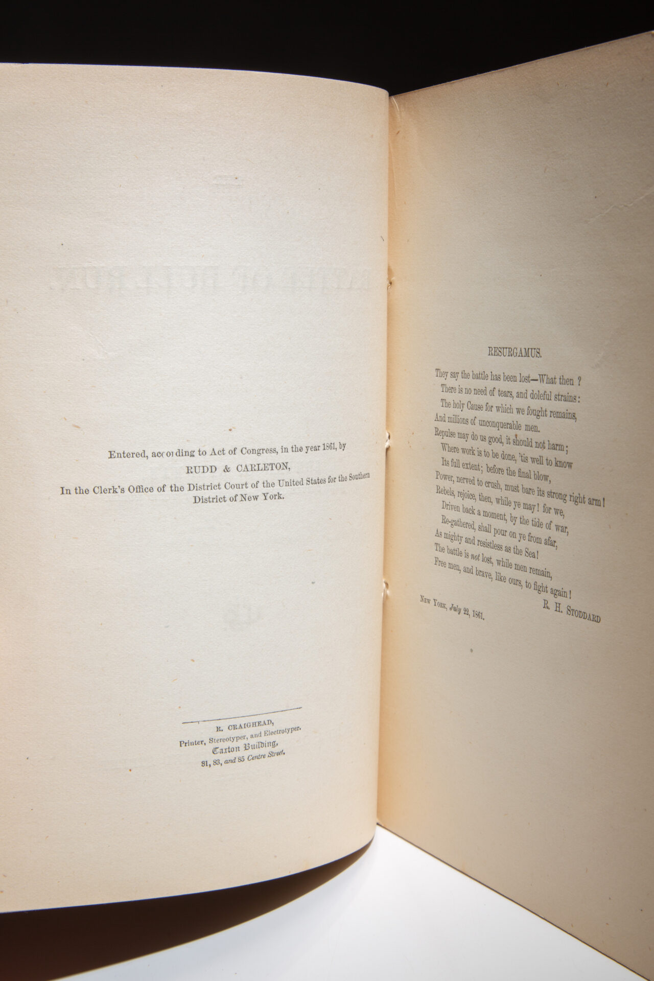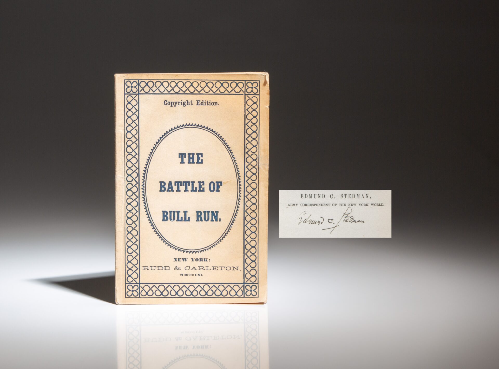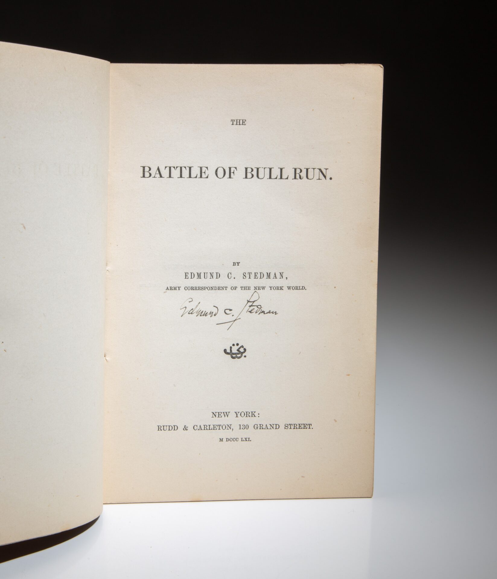 The first edition of The Battle of Bull Run, signed by the author, Edmund C. Stedman, published in 1861. The first published account of the Battle of Bull Run, following the original news reports.