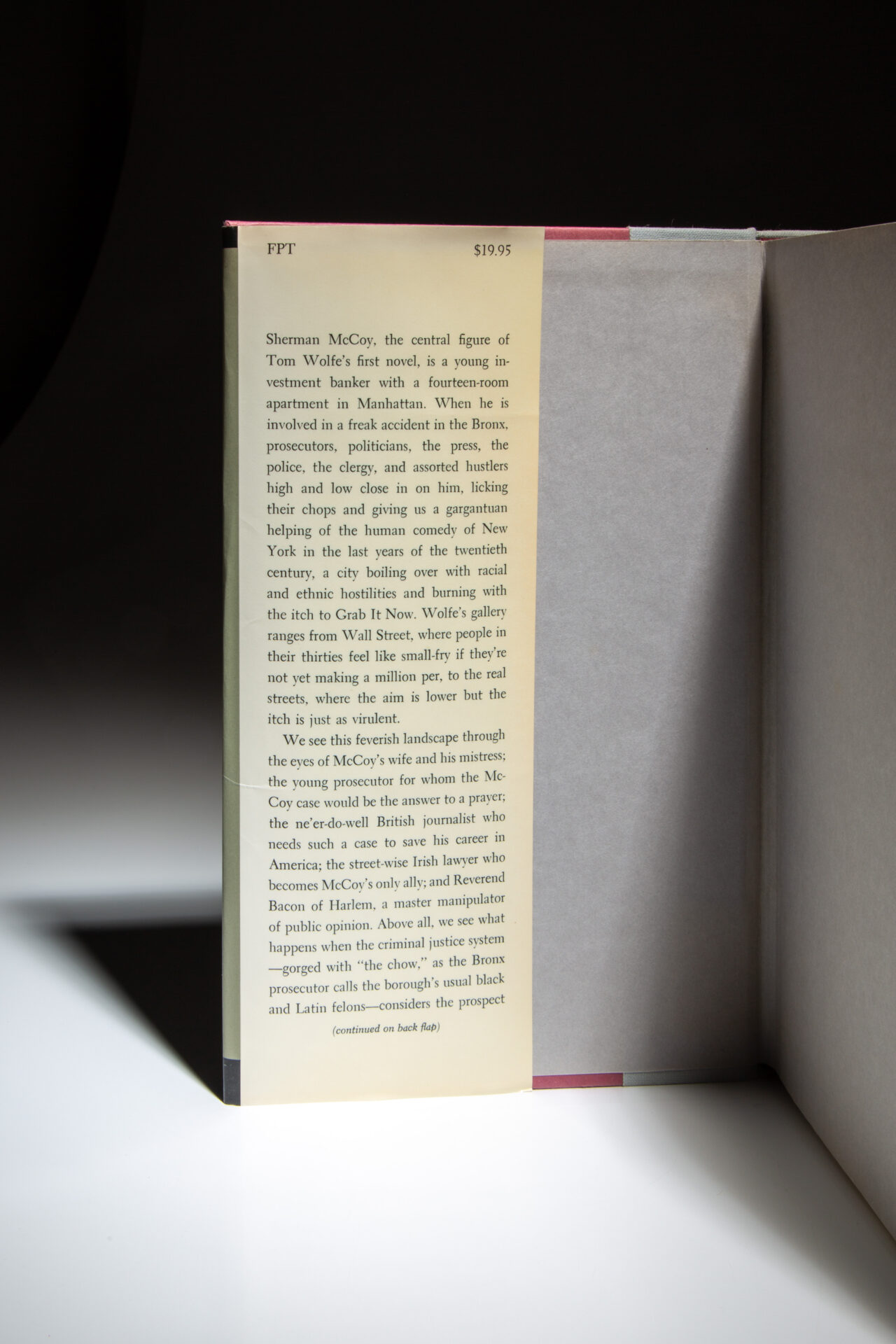 Thick octavo, [12], 659pp. [1]. Gray cloth spine, maroon boards, title in black over cloth. Stated “First printing, 1987” on copyright page. Light wear along edges of text block, otherwise fine. In the publisher’s first state dust jacket, with $19.95 on front flap, “By The Author of The Right Stuff” along bottom edge of front panel, ISBN number on back flap which reads “374-11534-6,” a near fine example.