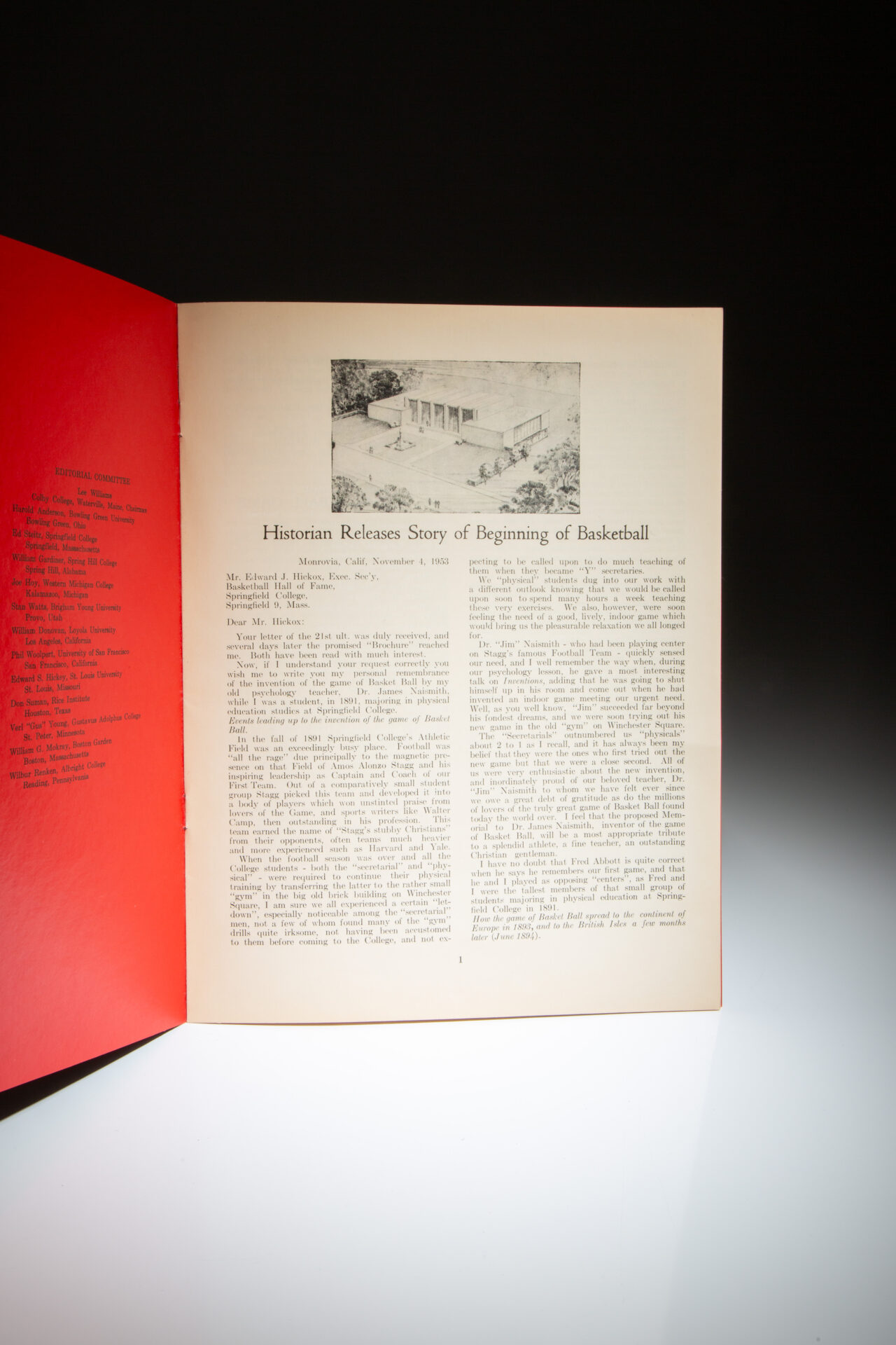Octavo, 8pp. Publisher’s red paper wrappers, bound at the spine with two staples. First day of issue stamp, the “Naismith 1861-1961” commemorative, affixed to the cover. Includes two articles on the history of basketball, one by Dr. Naismith.