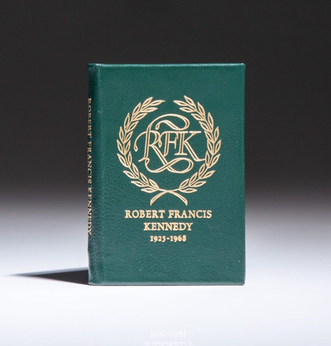Miniature volume, 27pp. Green morocco, Robert Francis Kennedy 1925-1968 in gilt on front panel with decorative gilt illustration. Green endpapers, all edges gilt. Book measures approximately 2 x 2.7 inches. Frontispiece portrait of Kennedy tipped in. Minimal shelf wear to covers. Limited edition of 2000 copies.