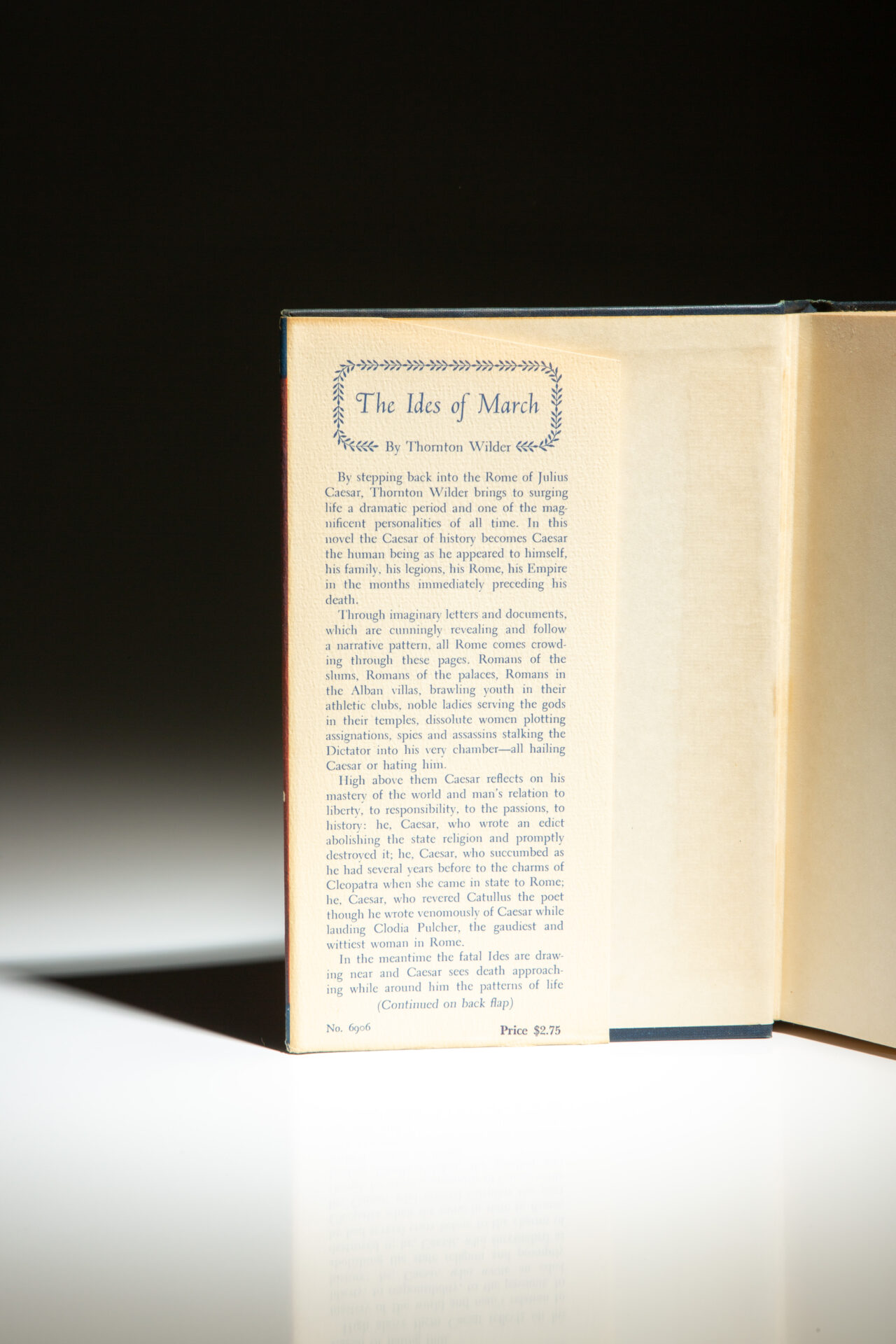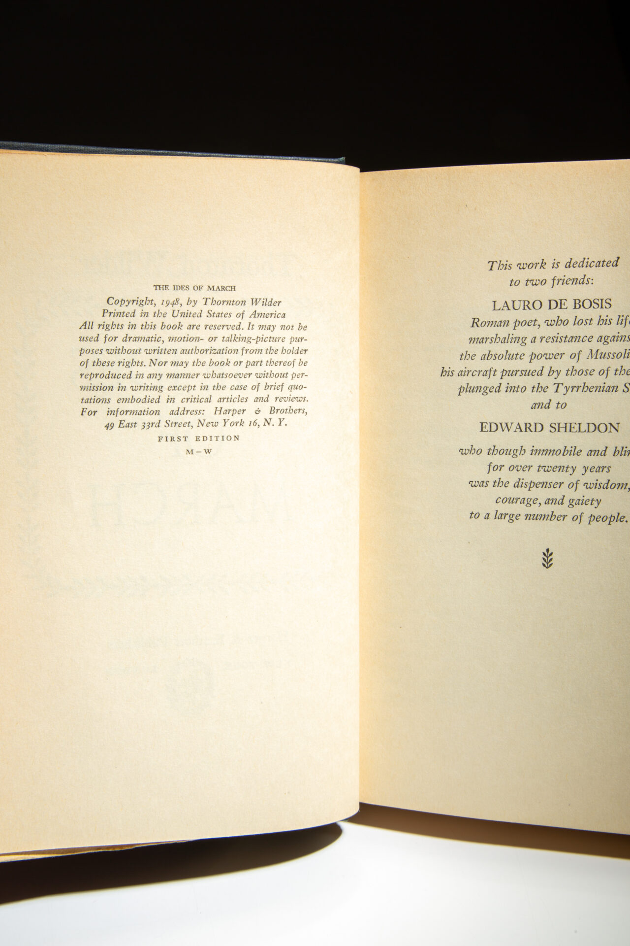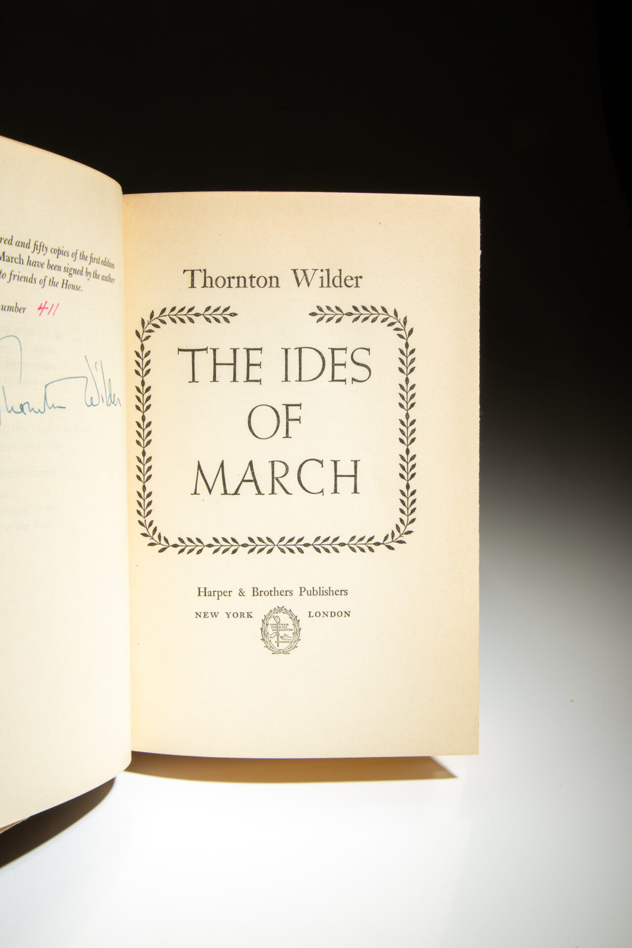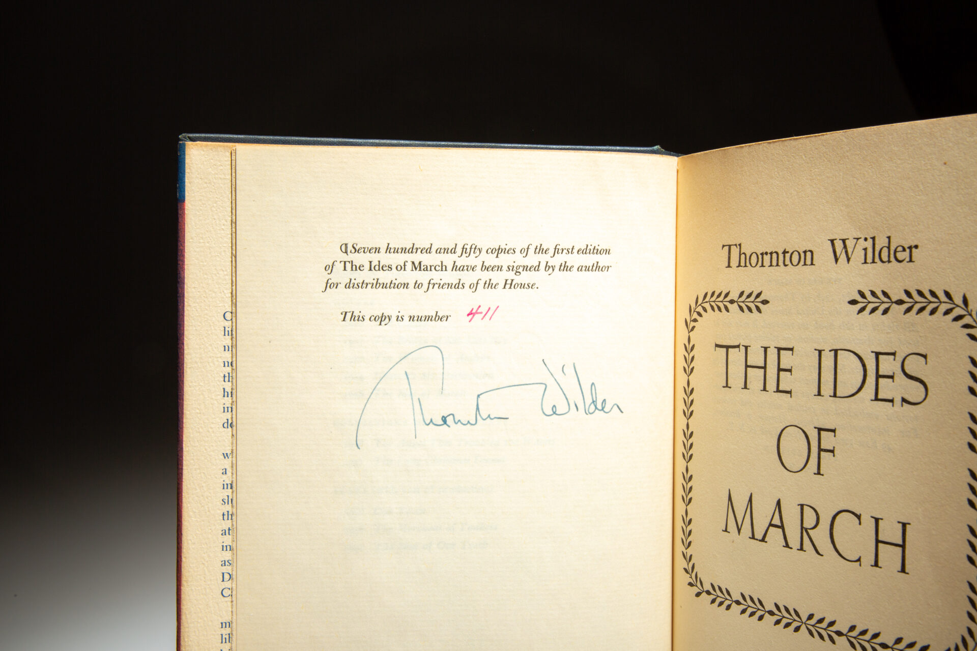 Limitation page reads: “Seven hundred and fifty copies of the first edition of The Ides of March have been signed by the author for distribution to friends of the House.” This copy is numbered 411 and signed by Thornton Wilder.