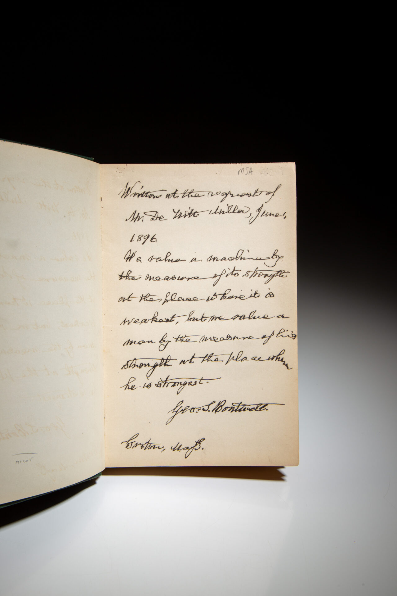 Inscribed by George F. Boutwell on the second free endpaper, with a quote from the book: “Written at the request of Mr. De Witt, June 1, 1896. / We value a machine by the measure of it’s strength at the place where it is weakest, but we value a man by the measure of his strength at the place where he is strongest. George F. Boutwell. Groton, Mass.”