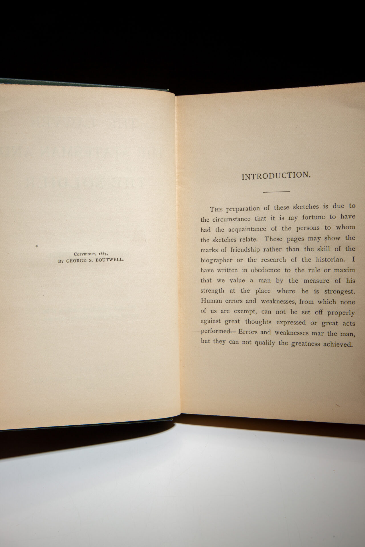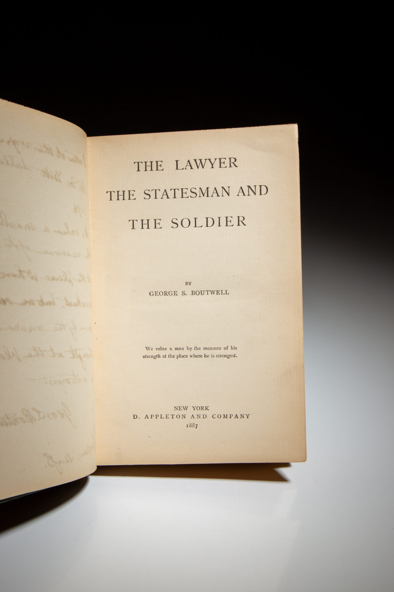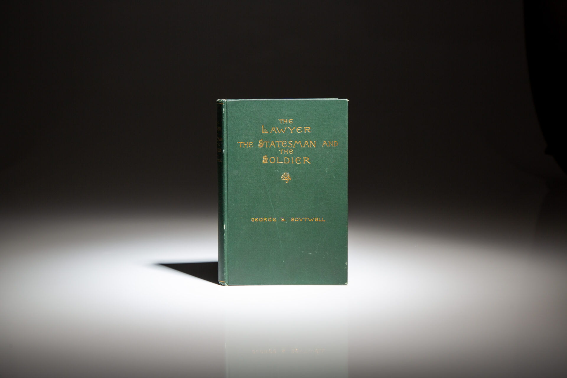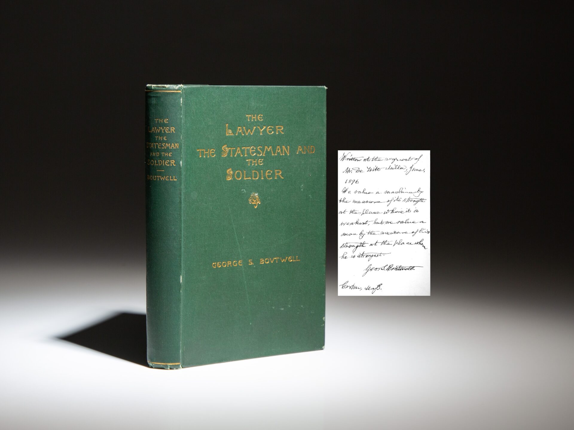 The first edition of The Lawyer, The Statesman, and The Soldier, inscribed by Senator George F. Boutwell. This work is collection of historical sketches of Rufus Choate, Daniel Webster, President Abraham Lincoln, and General U.S. Grant.