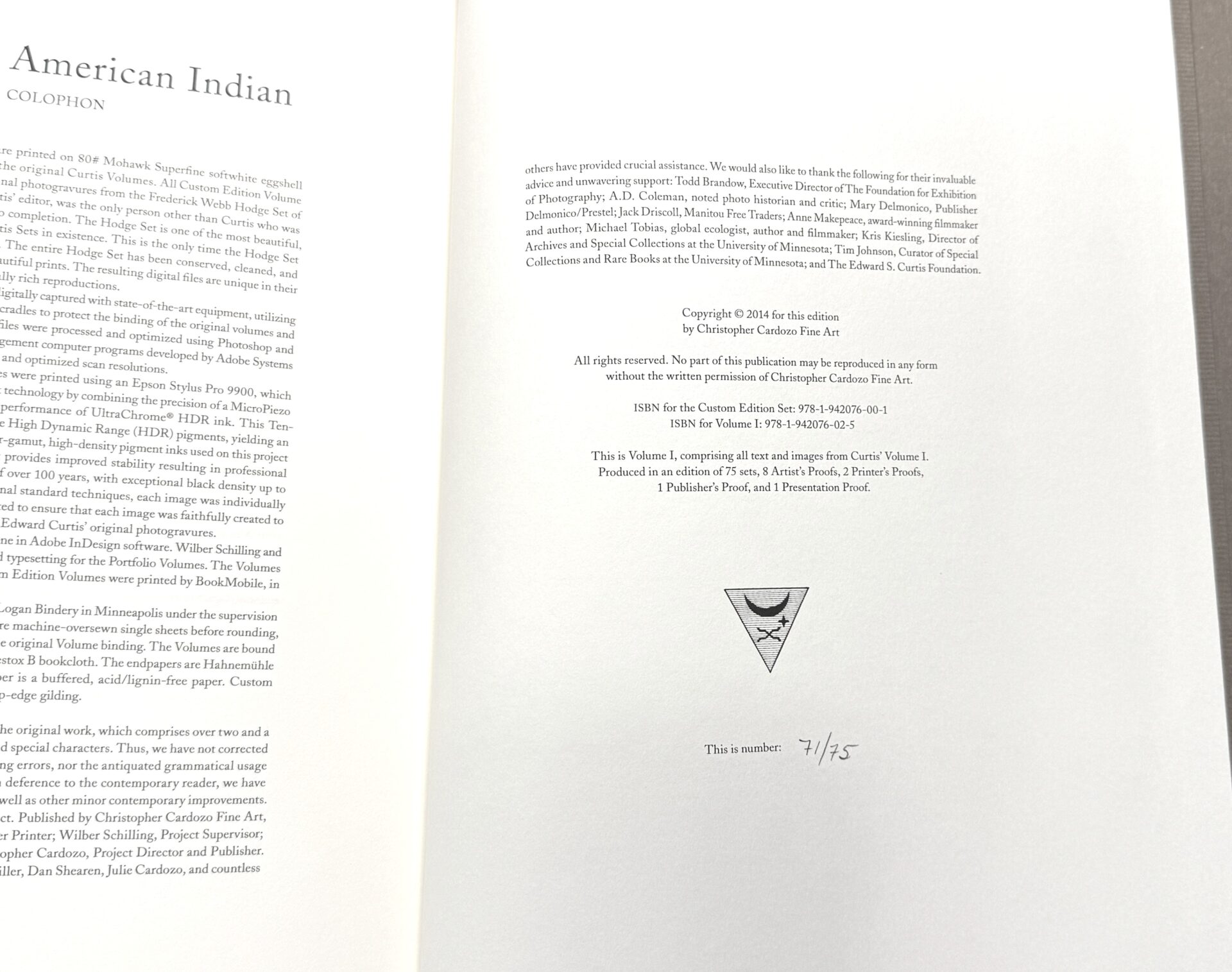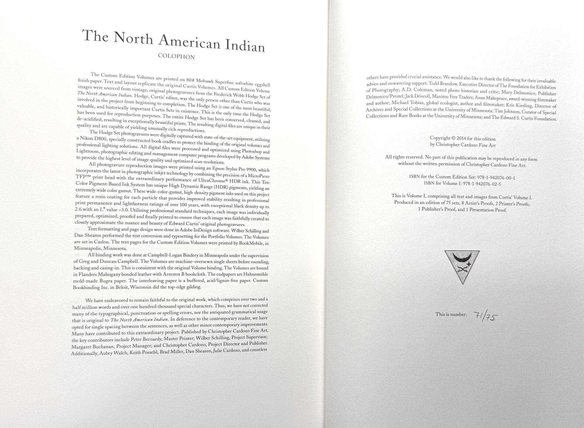 All of the Custom Edition images were sourced from the original photogravures in the Frederick Webb Hall Set of The North American Indian. (Howes C965) It is the only time that The Hodge Set has been used for this type of reproduction. The original publication was limited to 500 sets, but it is believed that only 272 sets were bound and sold by the publisher, at a subscription price of $3,000 per set. The project was funded by J.P. Morgan, who gave Curtis interest free loans of $15,000 per year. (Pritzker, 14)