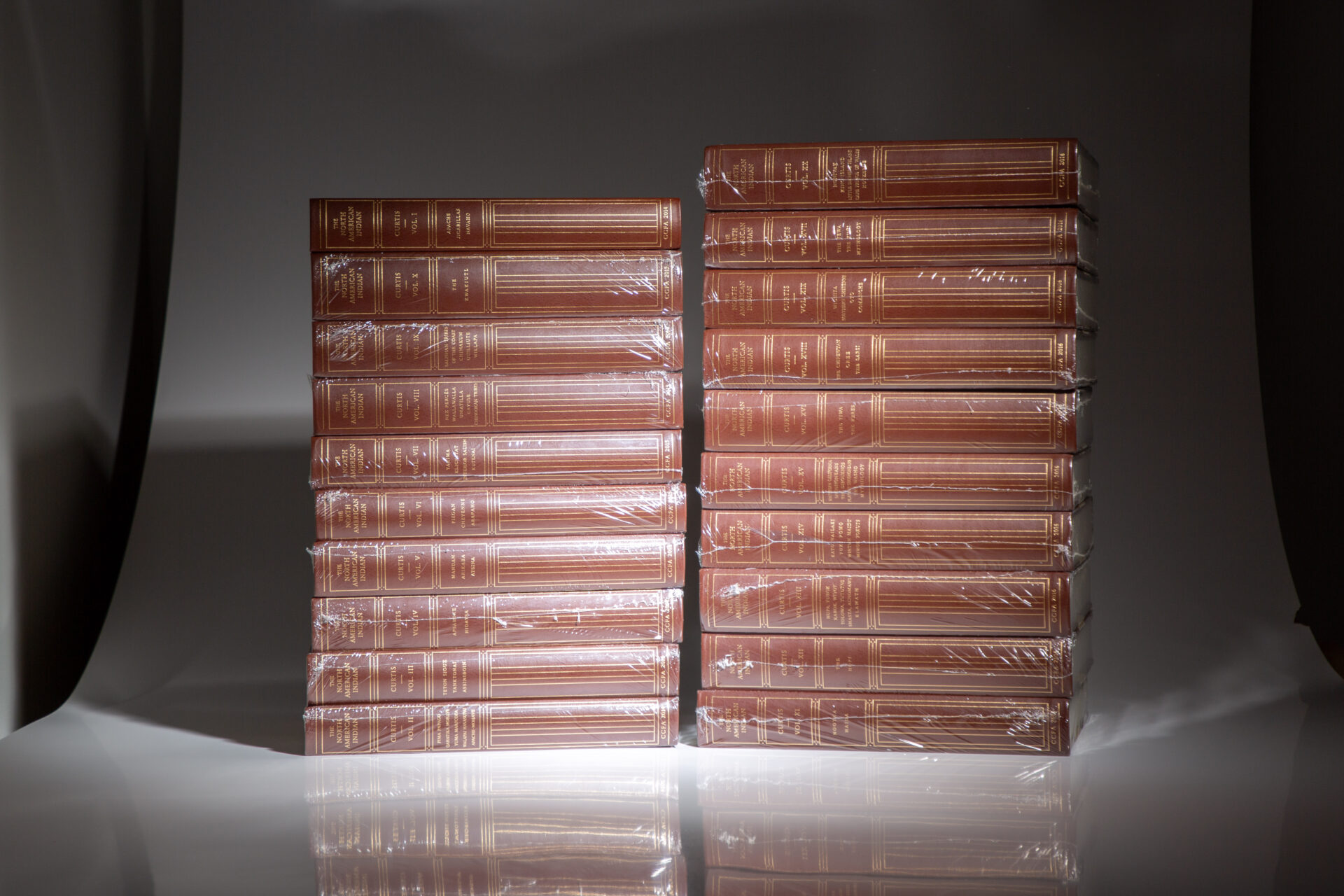 Quarto, [twenty volumes], 5,023pp. Folio, [five volumes], 723 photogravure plates. Three quarter mahogany bonded leather, archival beige cloth boards, title in gilt on the spine, top edge gilt. Hand-stamped design in gilt on the spine, replicating the original design by Curtis. The original 20 portfolios were reproduced in 5 volumes. Only Volume I of the octavo editions and Volume I of the portfolios were removed from the publisher’s shrink wrap for review.