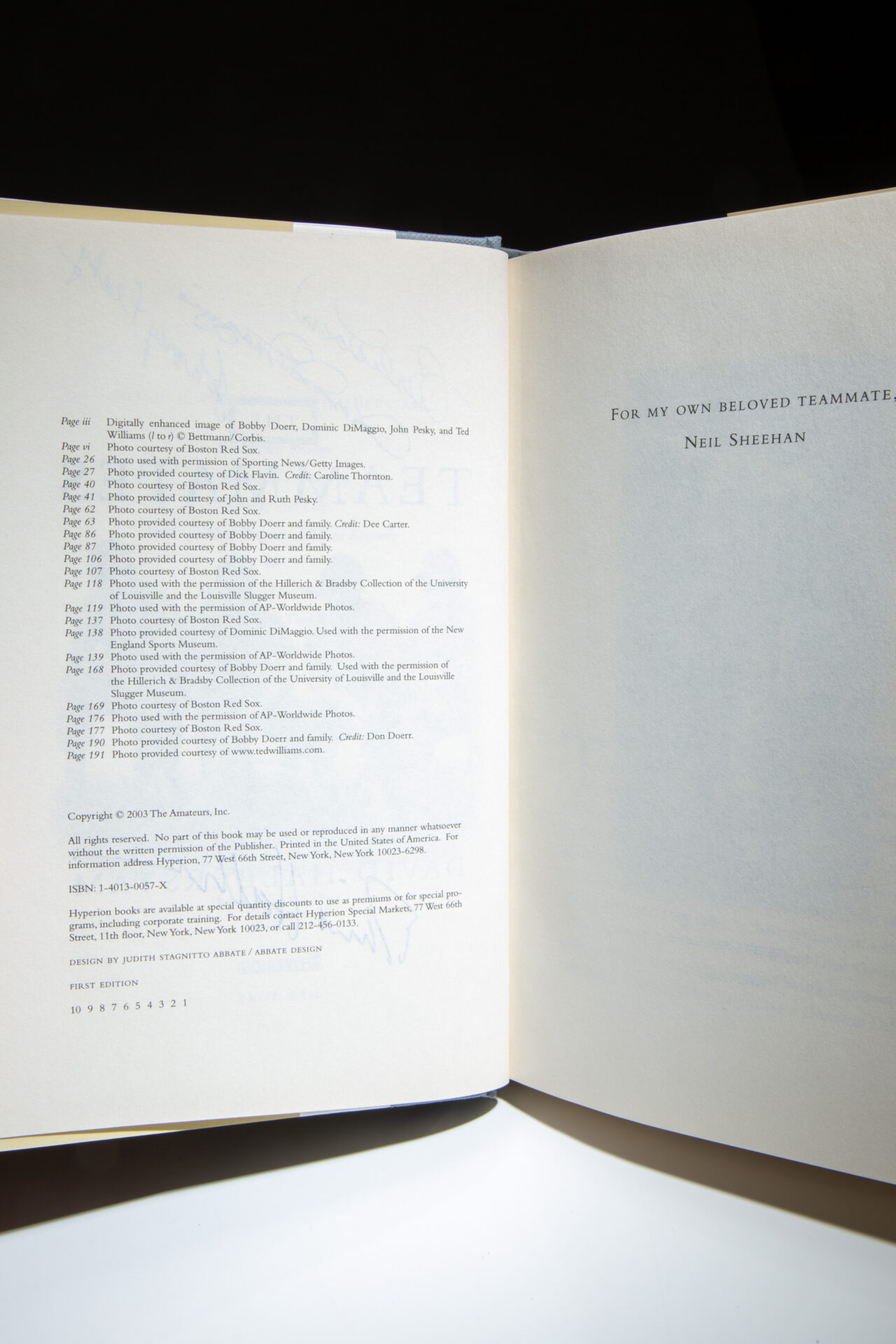 Signed on the title page by Bob Doerr, Dom DiMaggio, Johnny Pesky, and the author, David Halberstam.