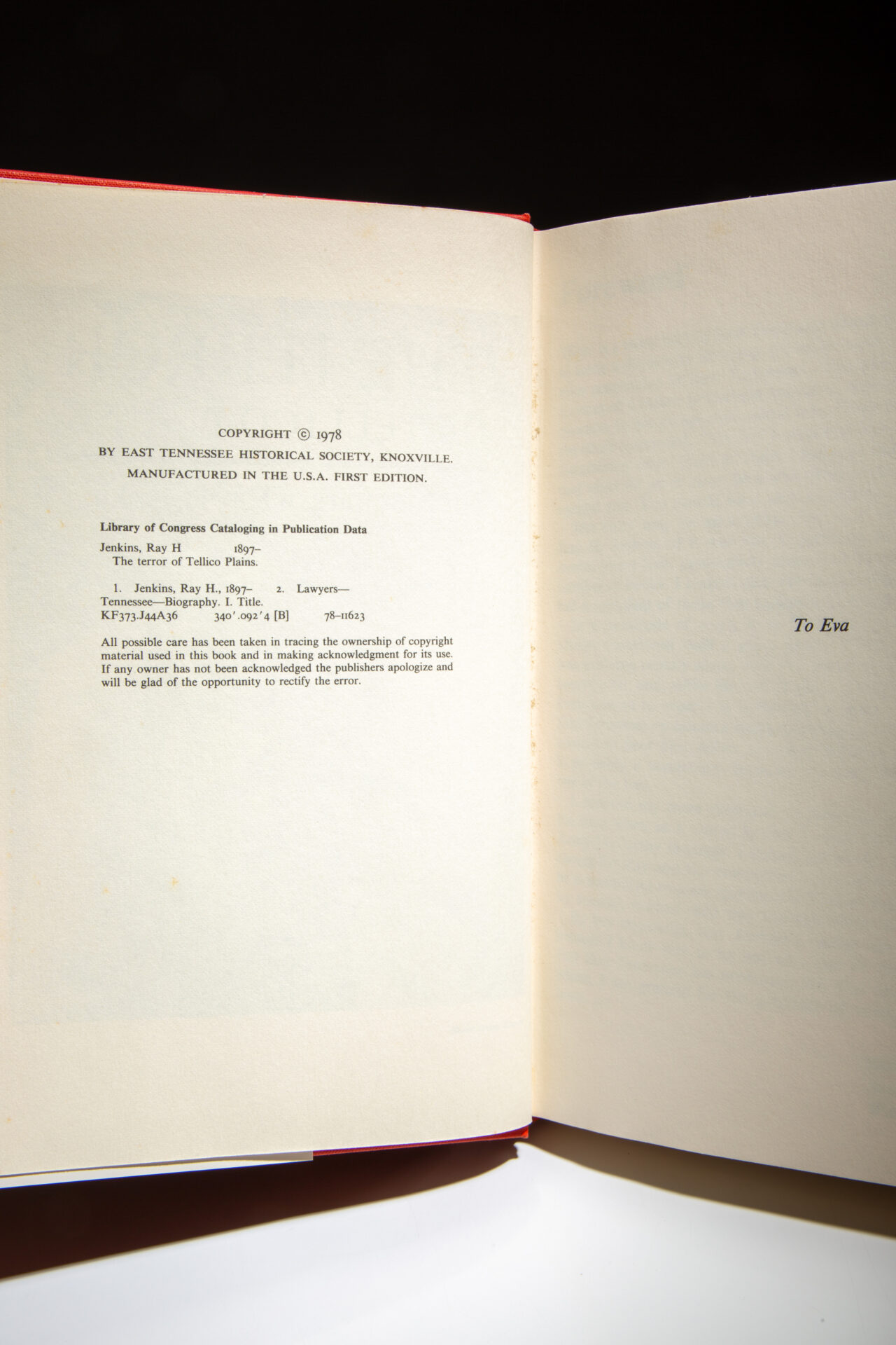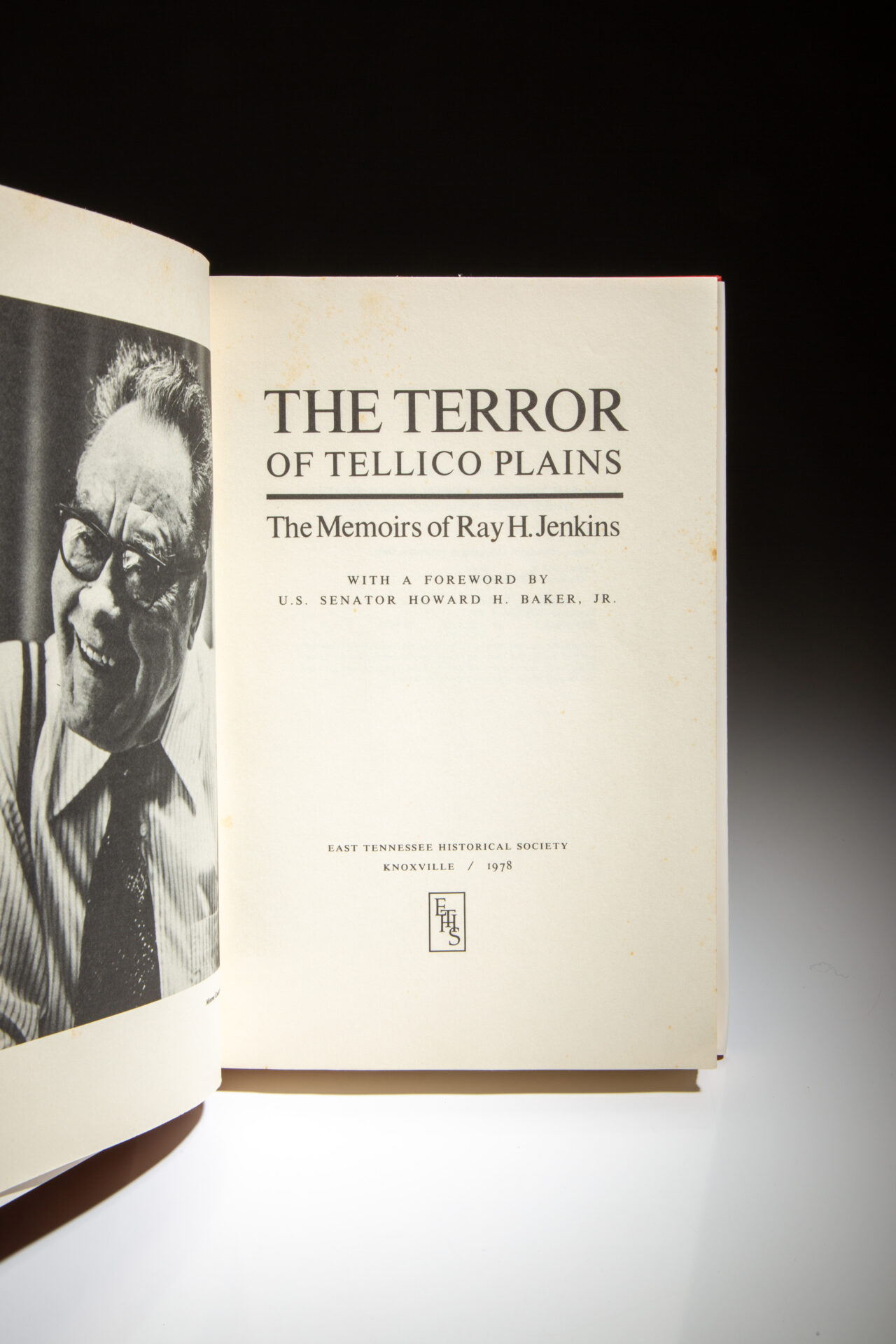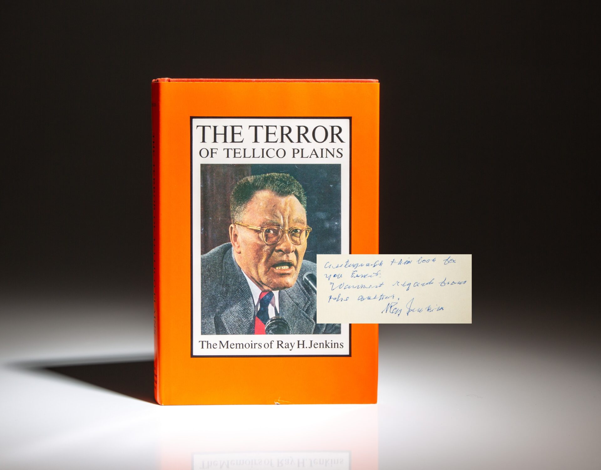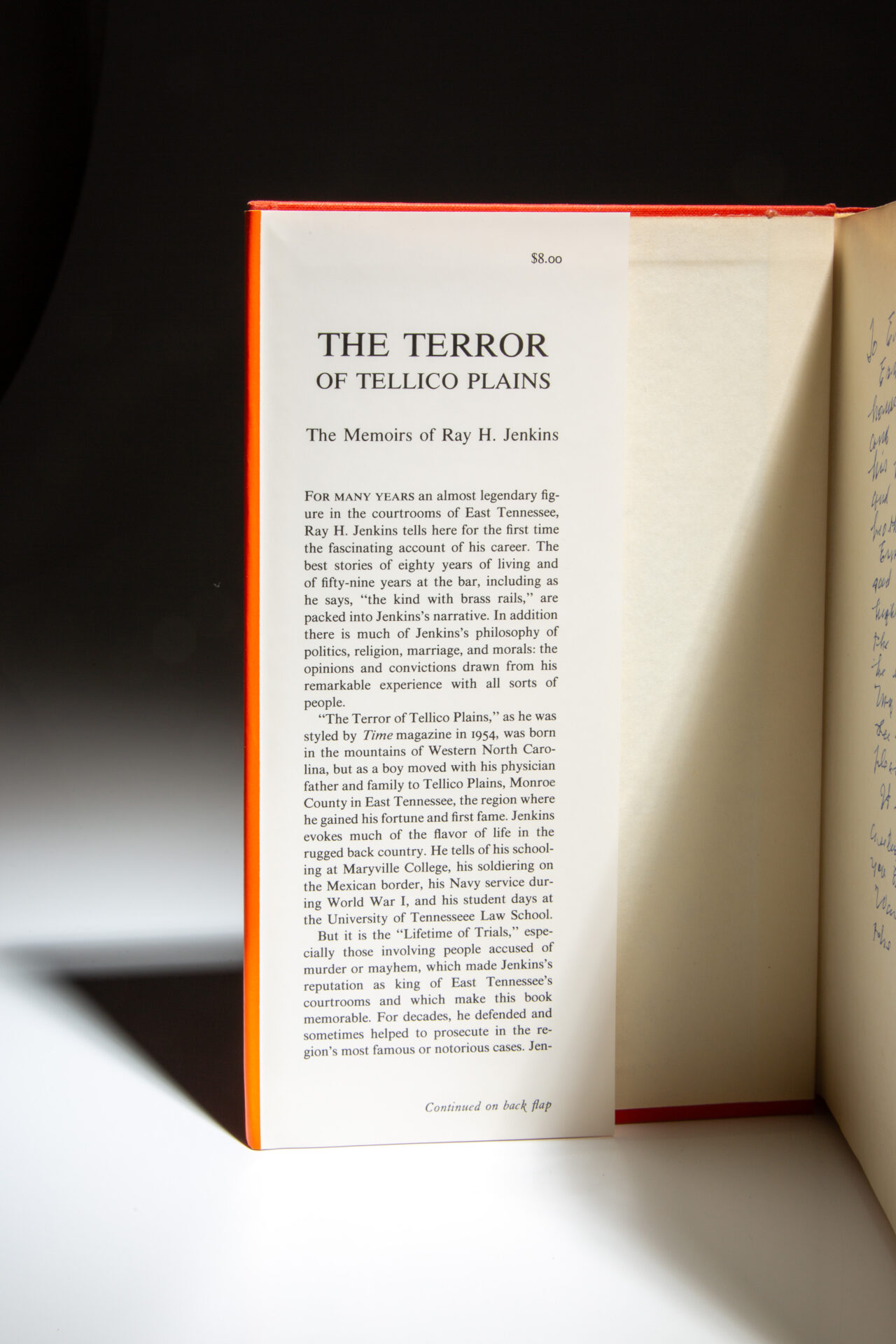 Signed first edition of The Terror Of Tellico Plains: The Memoirs of Ray H. Jenkins, inscribed by the author.