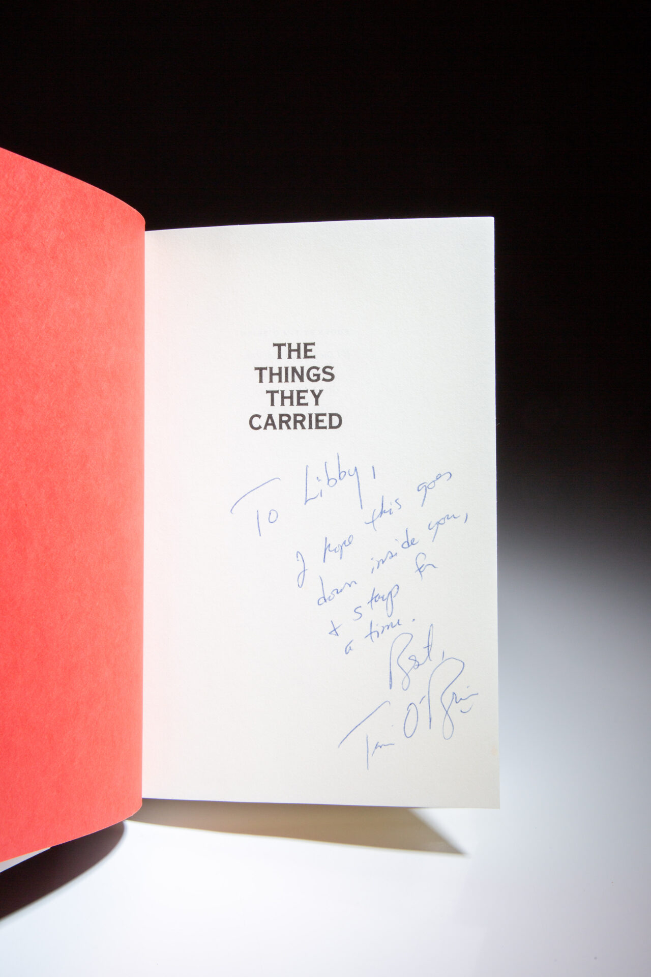 Signed by the author on the half title: “To Libby, I hope this goes down inside you, + stays for a time. Best, Tim O’Brien.”