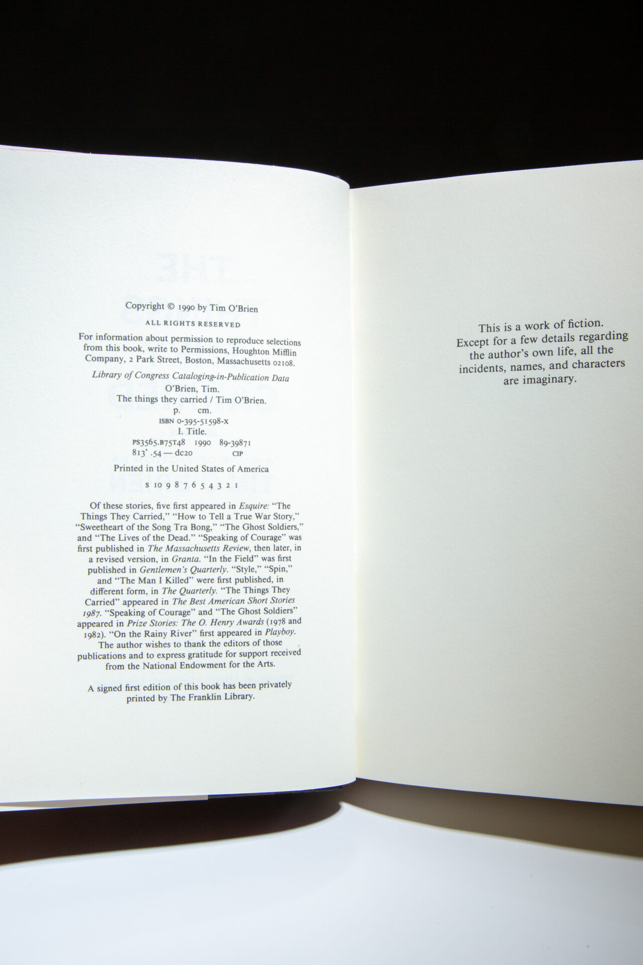 Signed first edition, first printing of The Things They Carried by Tim O’Brien.