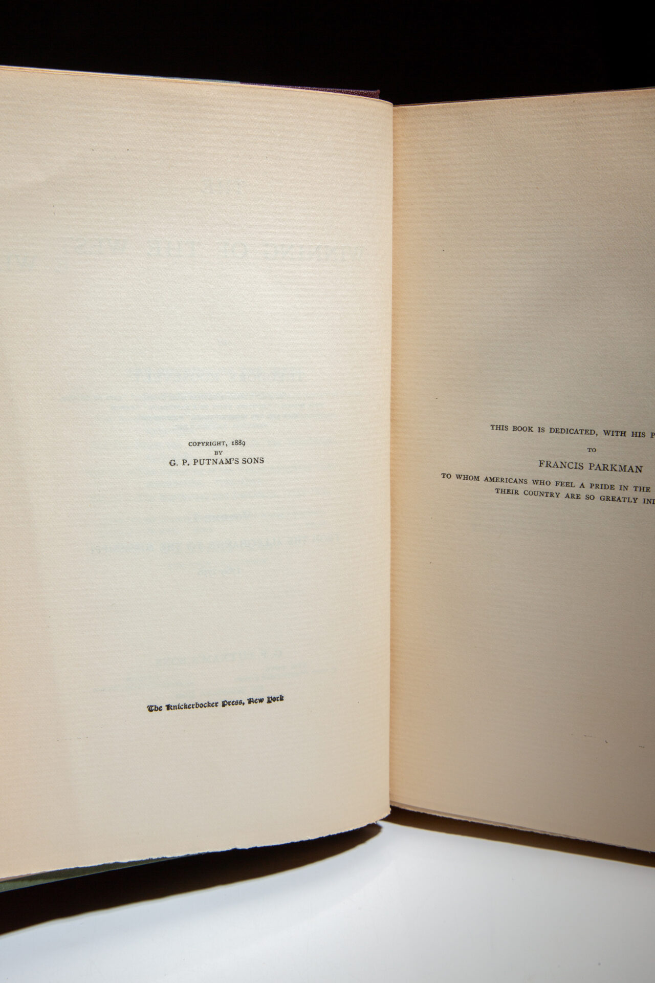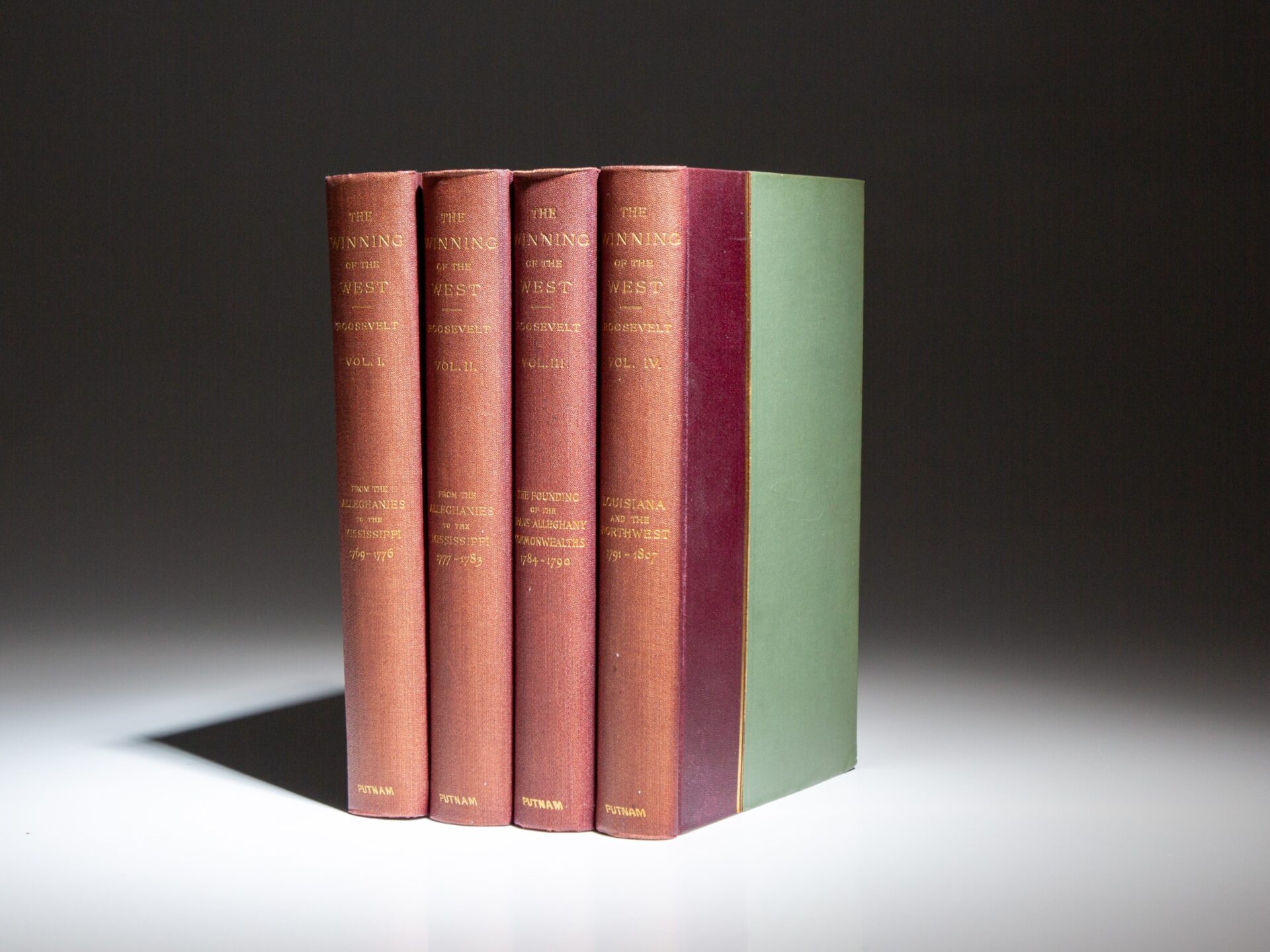 Includes four volumes: From the Alleghenies to the Mississippi, 1769-1776; From the Alleghenies to the Mississippi, 1777-1783; Founding of the Trans-Alleghany Commonwealths, 1784-1790 and Louisiana and the Northwest, 1791-1807. Roosevelt referred to Winning of the West as his “magnum opus.” Each volume was sold separately for $2.50. By the time Volume IV was published in 1896, customers who purchased the four-volume set would receive a mixture of publication years for the book. (Cole & Vail, A11.g)