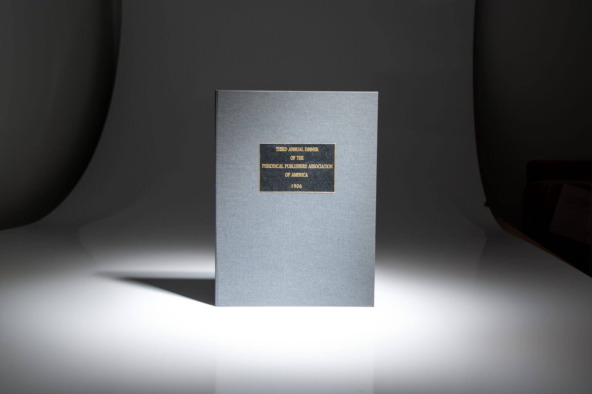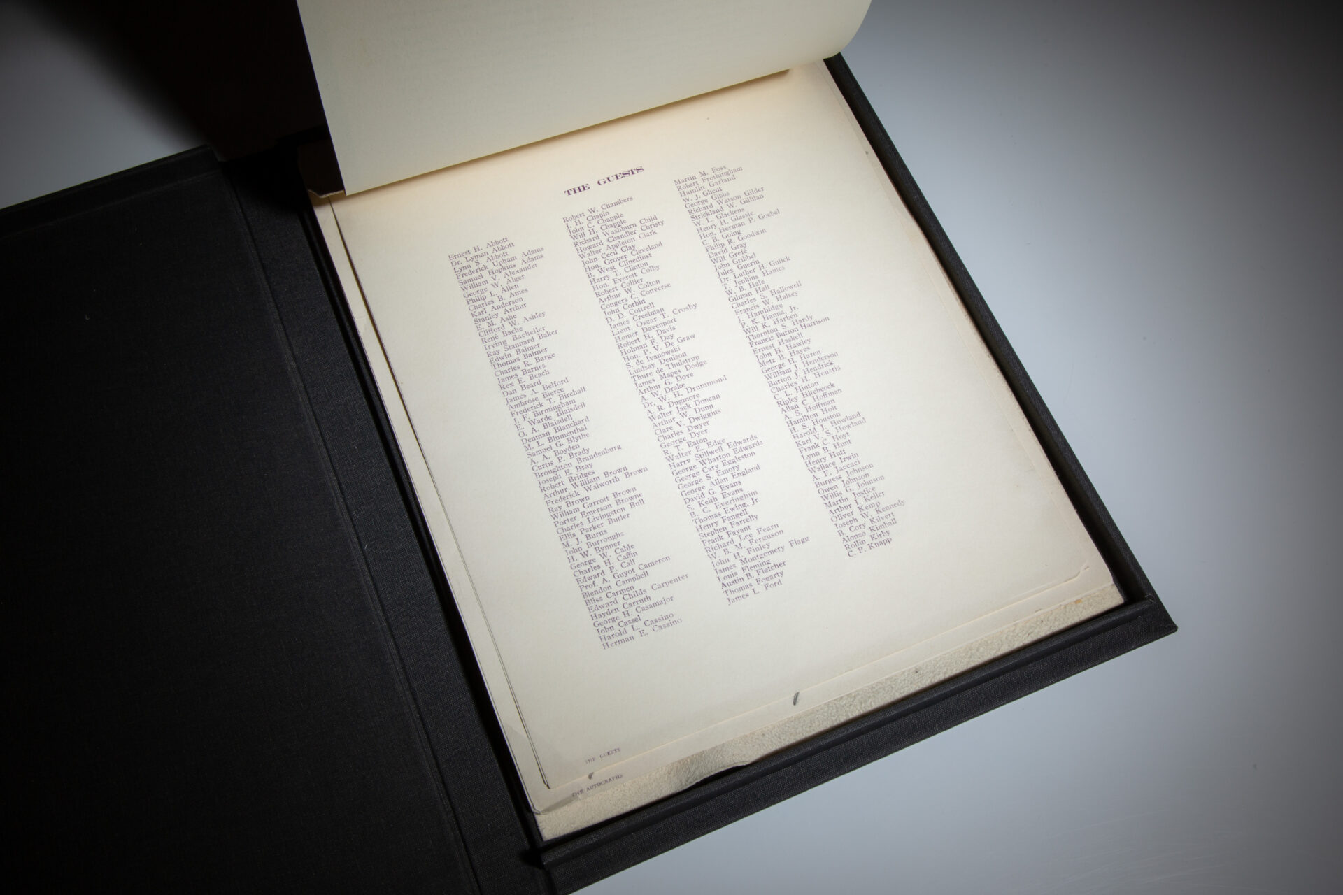Quarto, [7]. Backed with white calf, bound along the top edge with a silk ribbon. Light soiling to covers, a few short closed tears along the margins of The Autographs leaf. Includes a list of speakers, the dinner menu, notable hosts and guests. Housed in a custom black cloth clamshell, title stamped in gilt on a black morocco label.