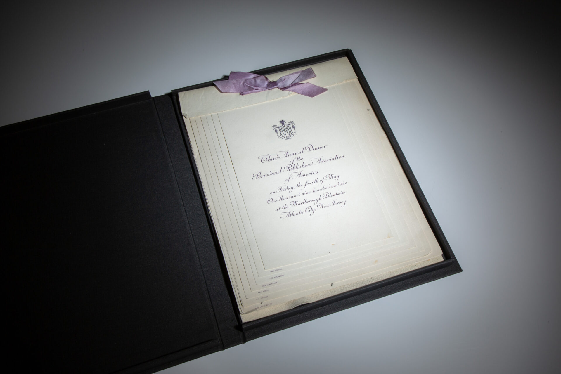 The program for the Third Annual Periodical Publishers’ Association meeting on May 4, 1906, in Atlantic City, New Jersey. This program is signed by President Grover Cleveland, Edward Bok, Secretary of the Navy, Paul Morton and other notable participants at the event.