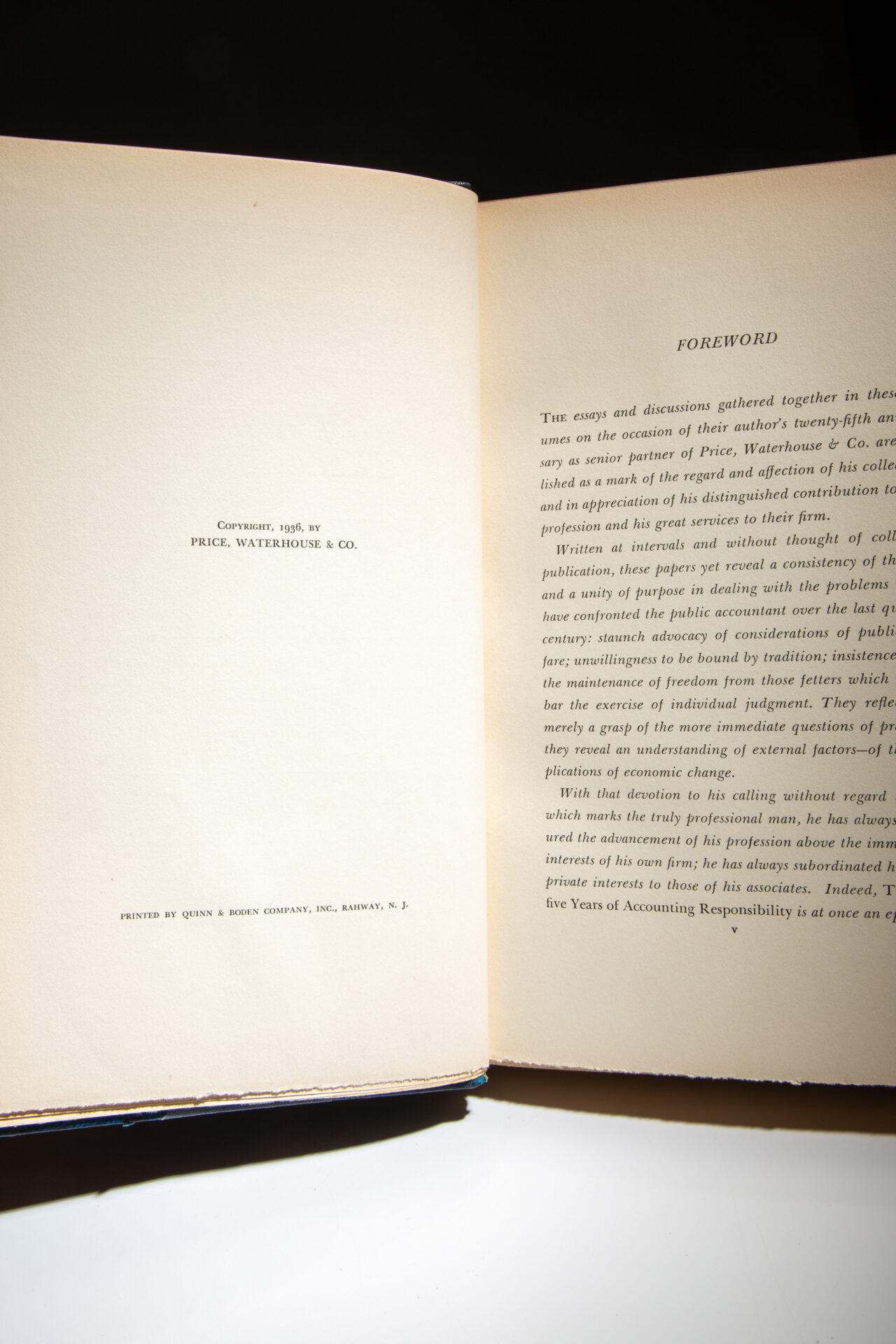Limited edition of Twenty-Five Years Of Accounting Responsibility, 1911-1936, inscribed by “the dean of American accounting,” George Oliver May.