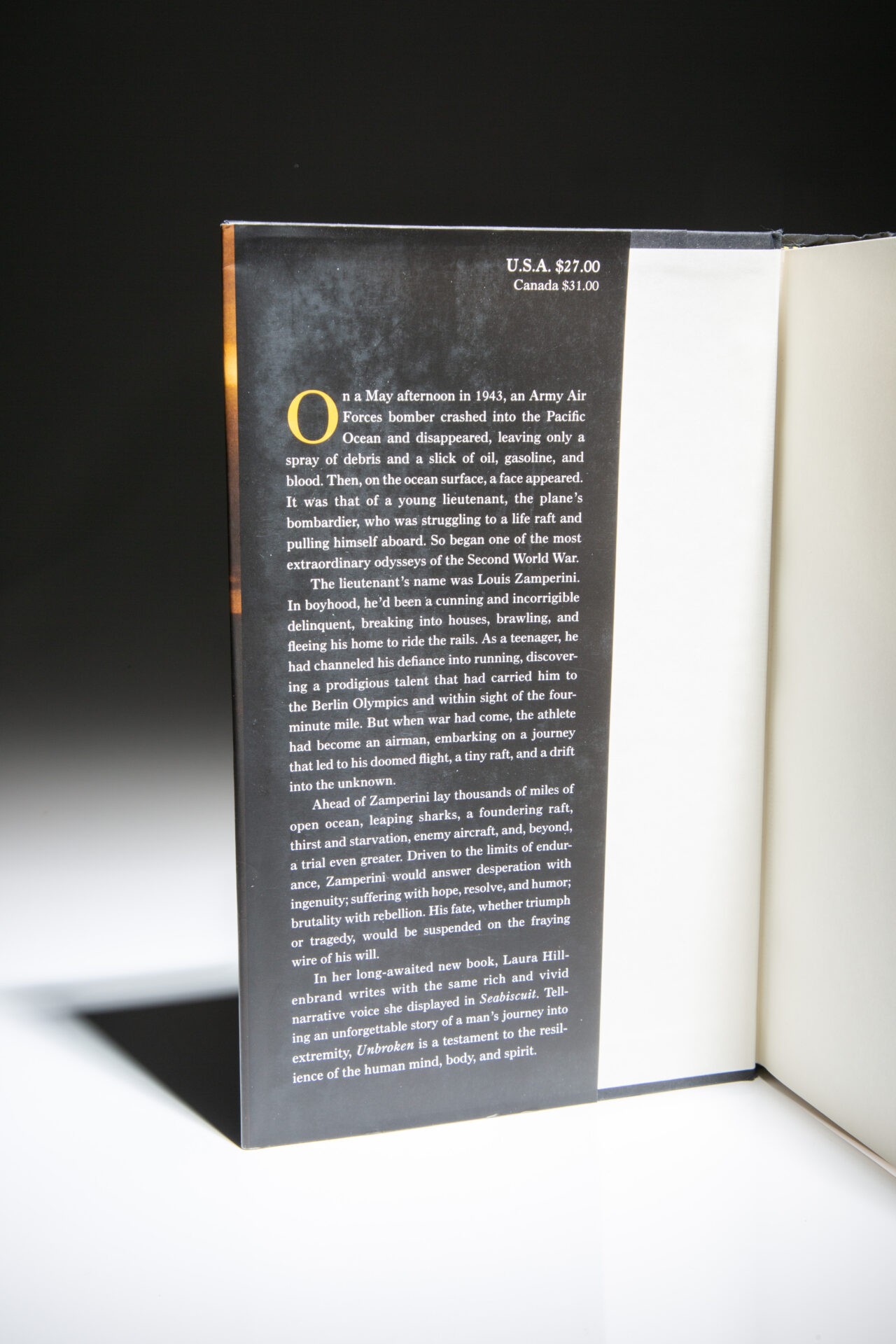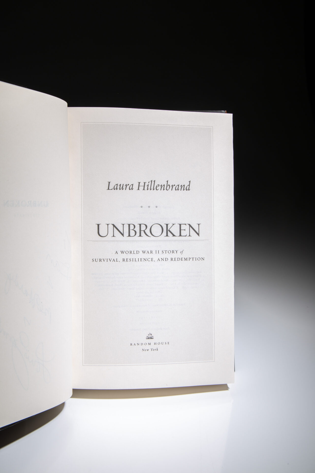 Octavo, xviii, 473pp, [5]. Black hardcover, title stamped in gilt on spine. Stated “First Edition” on the copyright page, with a full number line. Solid text block, light rubbing to boards, wear at head of the spine. In the publisher’s first state dust jacket, $27.00 on front flap, no mention of “New York Times Bestseller” on the front cover, “Advance Praise for Unbroken” as headline for blurbs on rear panel, touch of shelf wear, a near fine example.