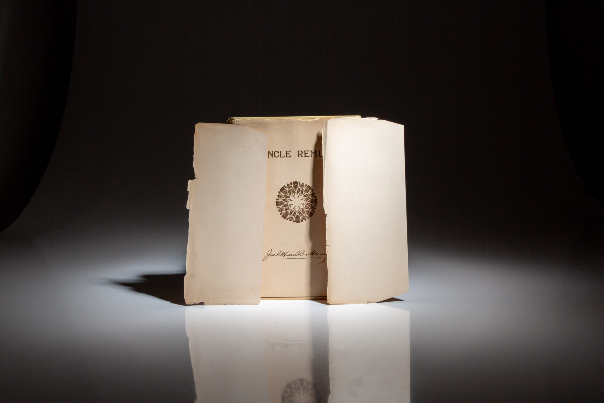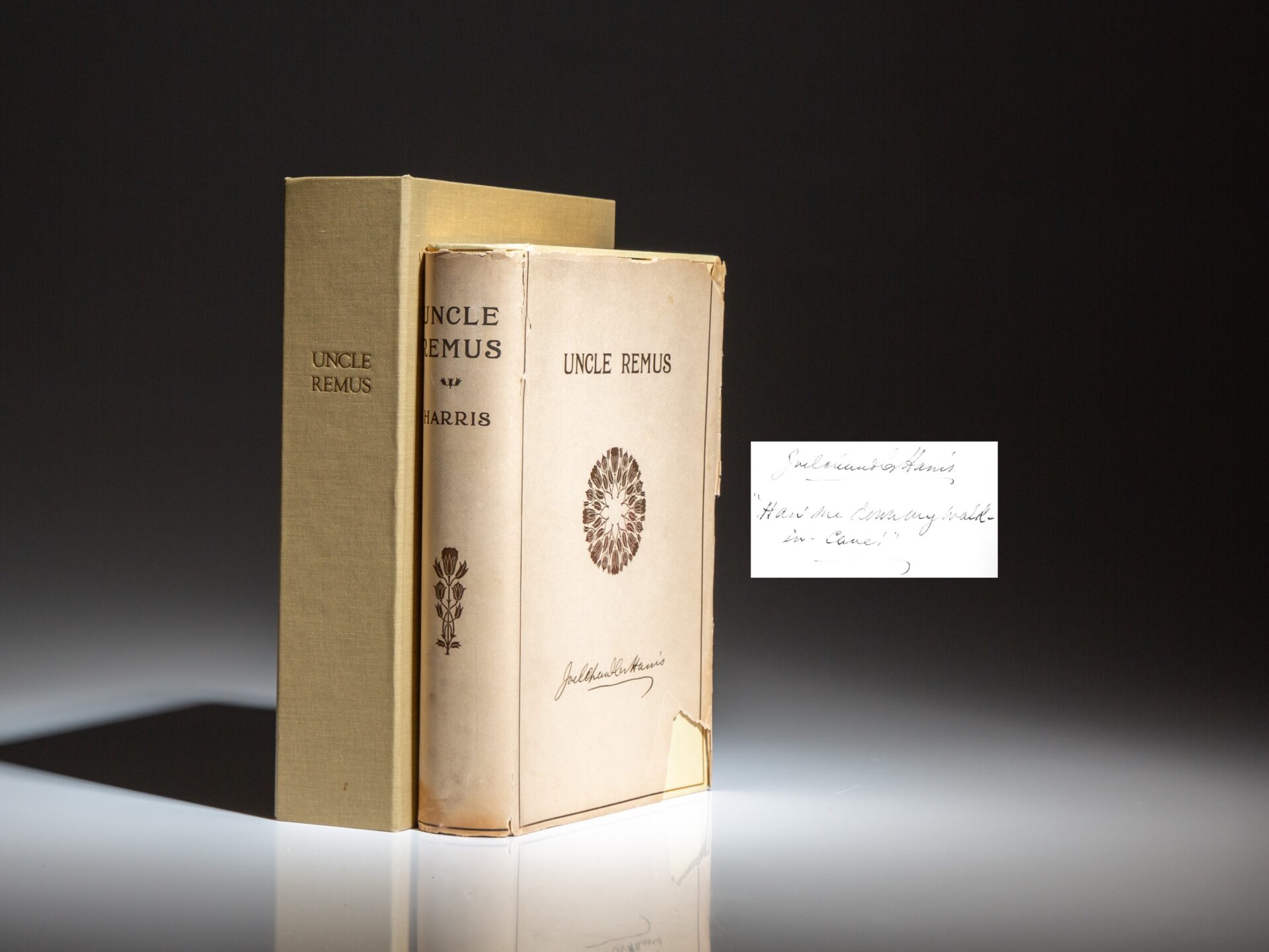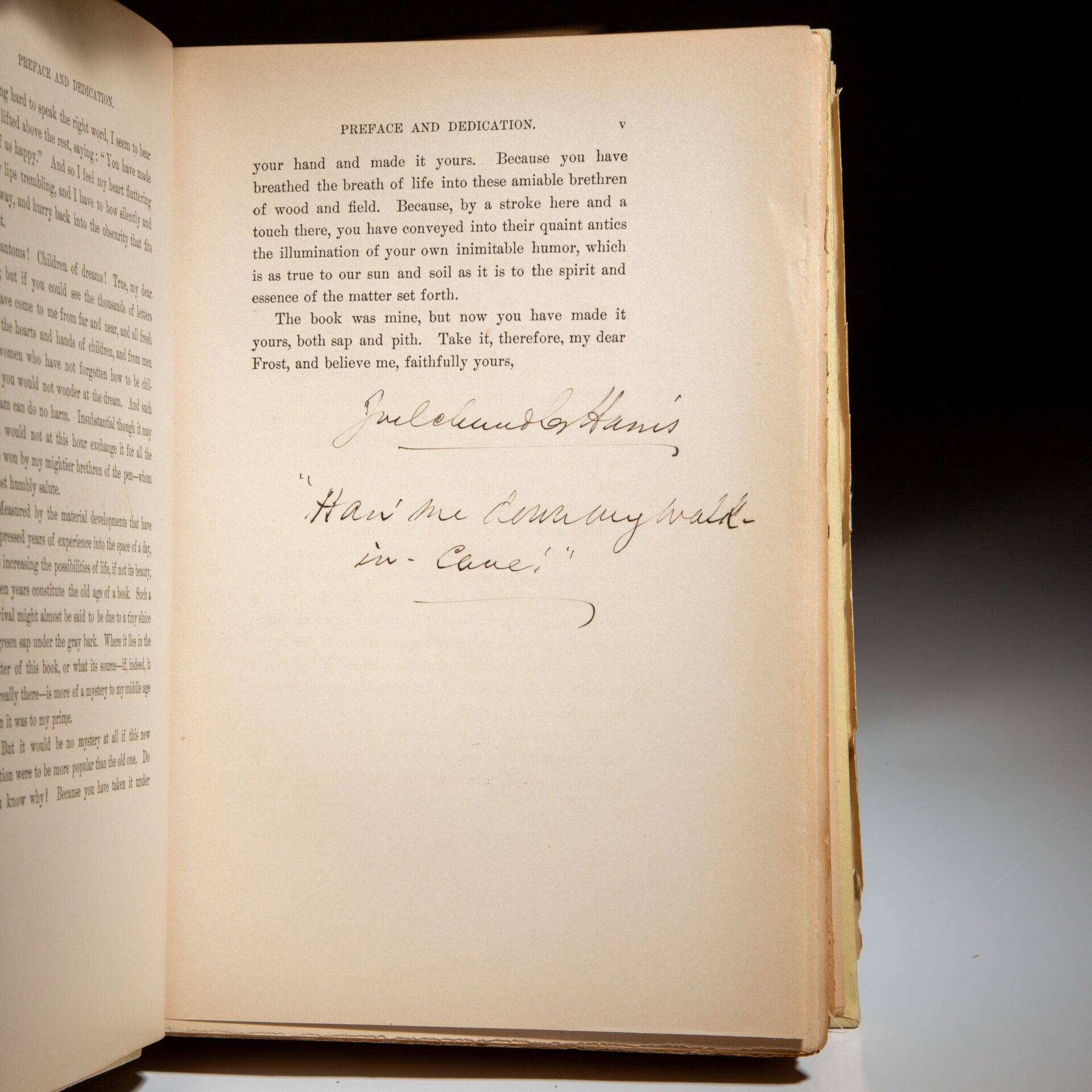 From a signed limited edition of 250 copies, this being number 109. Signed by the author after the dedication: “Joel Chandler Harris,” with an excerpt from the book: “Han’ me down my walkin’ cane.”