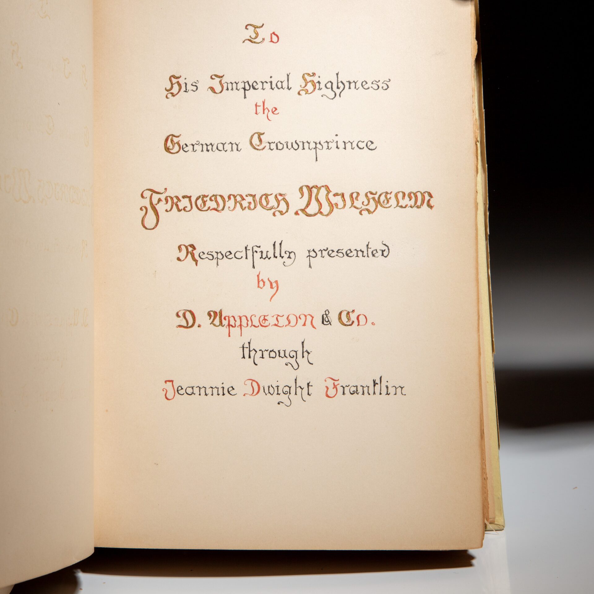 This copy was a presentation copy from D. Appleton & Company to the 13-year old, German Crown Prince Friedrich Wilhelm, the last German Crown Prince and Crown Prince of Prussia, before the abolition of the monarchy.