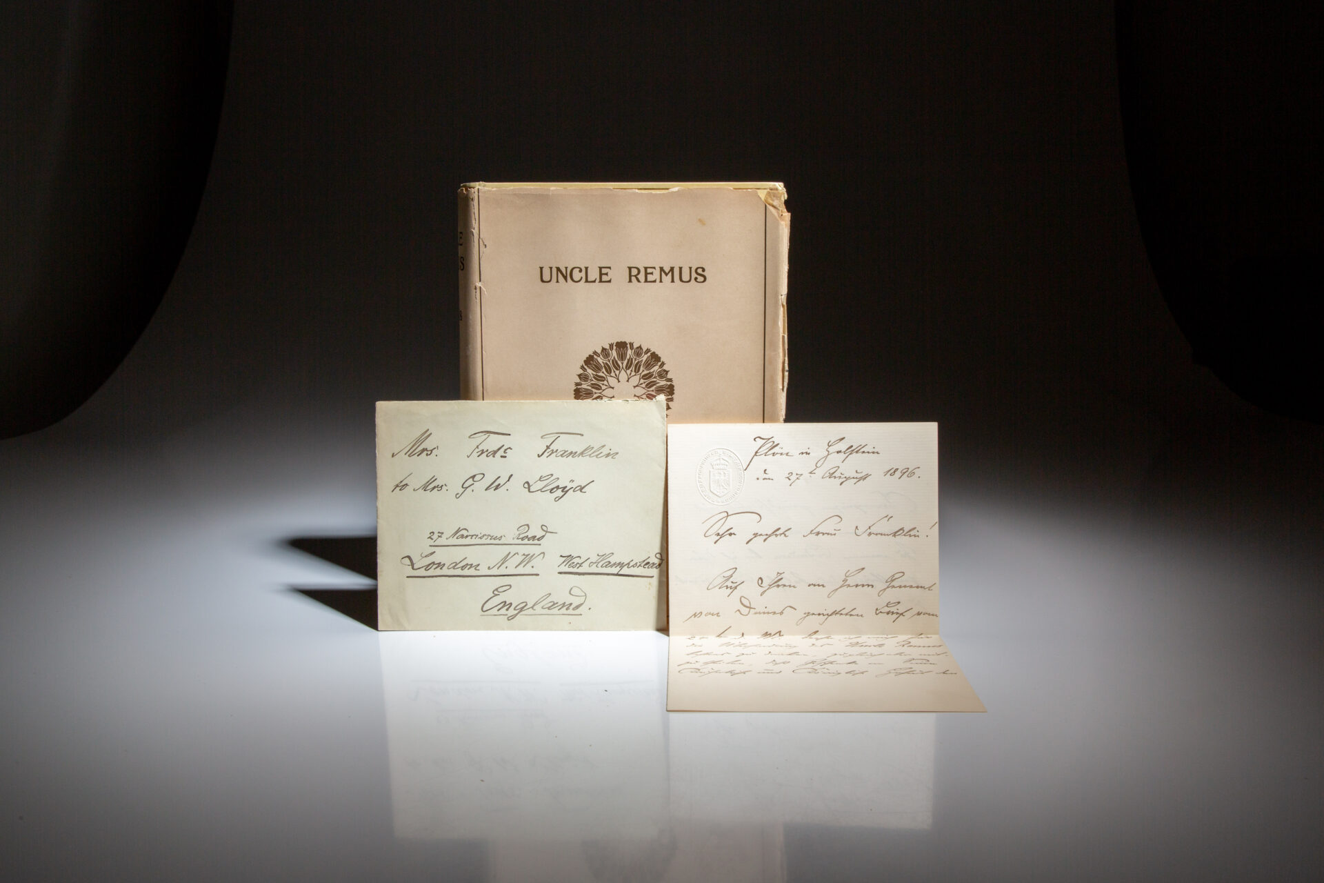 The first edition of Uncle Remus was published by D. Appleton in 1881. This New and Revised edition was issued in red buckram as a trade edition. (Provenance: Estate of Actor and Comedian, Arte Johnson, purchased in 2025). This work includes a letter from Freiherr von Lyncker, the Baron von Lyncker (Lieutenant Colonel and First Military Governor), regretting that the gifts for the Crown Prince cannot be accepted, and the book must be returned. Here is a full translation of the letter: “Plön in Holstein, 27 August 1896 / Dear Mrs. Franklin, I am honored to write to you in response to your letter of the 24th of this month addressed to General von Deines, and to express my sincere gratitude for sending the Uncle Remus book. At the same time, I have to inform you that gifts to His Imperial and Royal Highness the Crown Prince are not accepted as a matter of principle. I therefore regret to inform you that I am obliged to return this lovely book. / Yours sincerely, Freiherr von Lyncker / Oberstleutnant and Erster Militär-Gouverneur.”