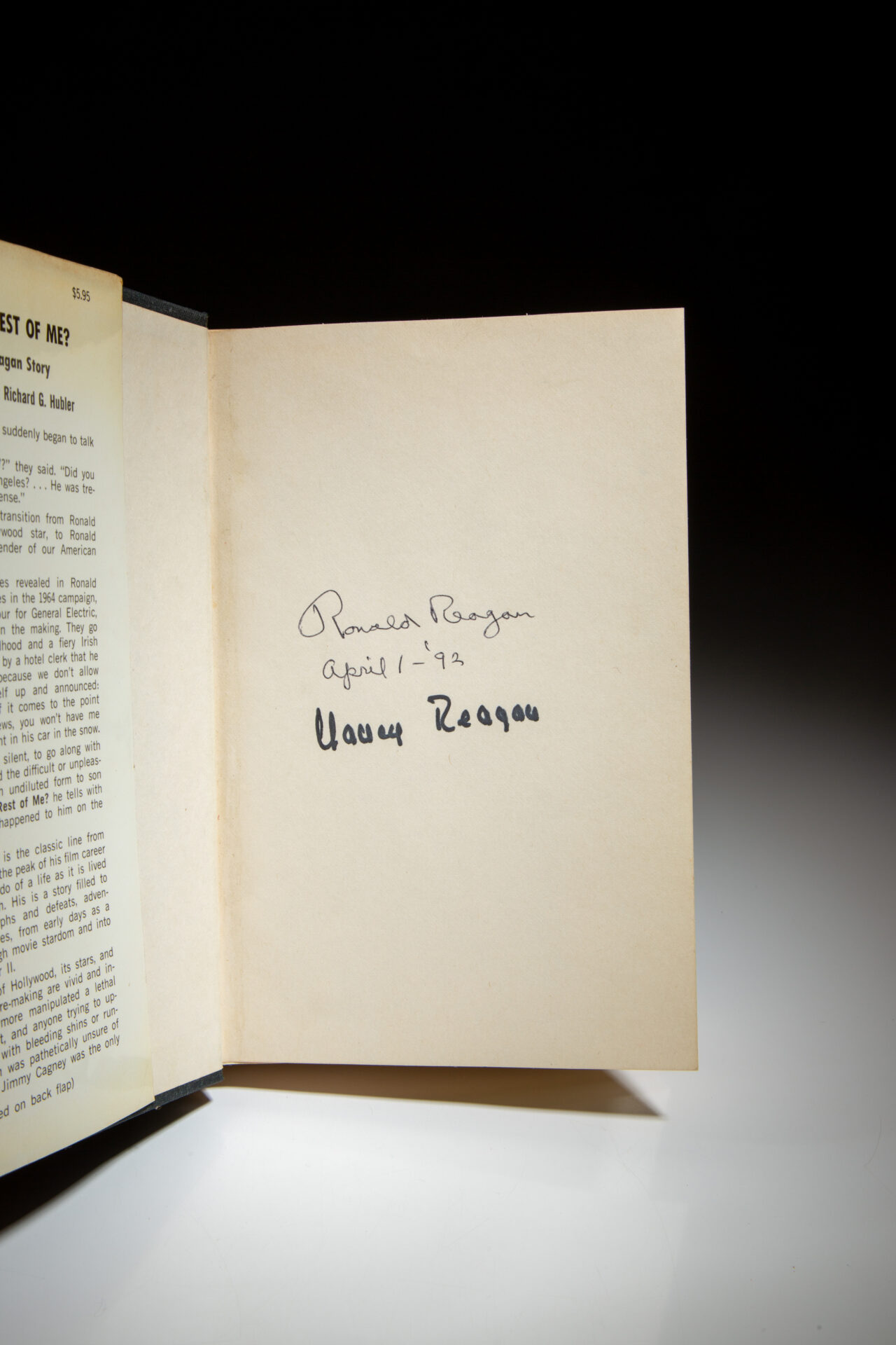 Signed on the front free endpaper by Nancy Reagan and Ronald Reagan, dated “April 1- ’92.”