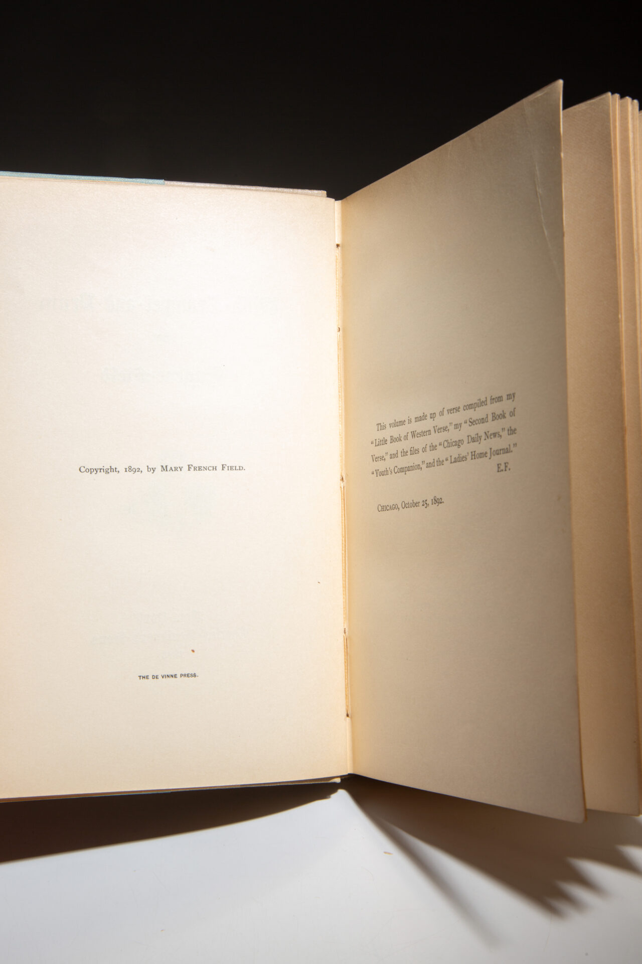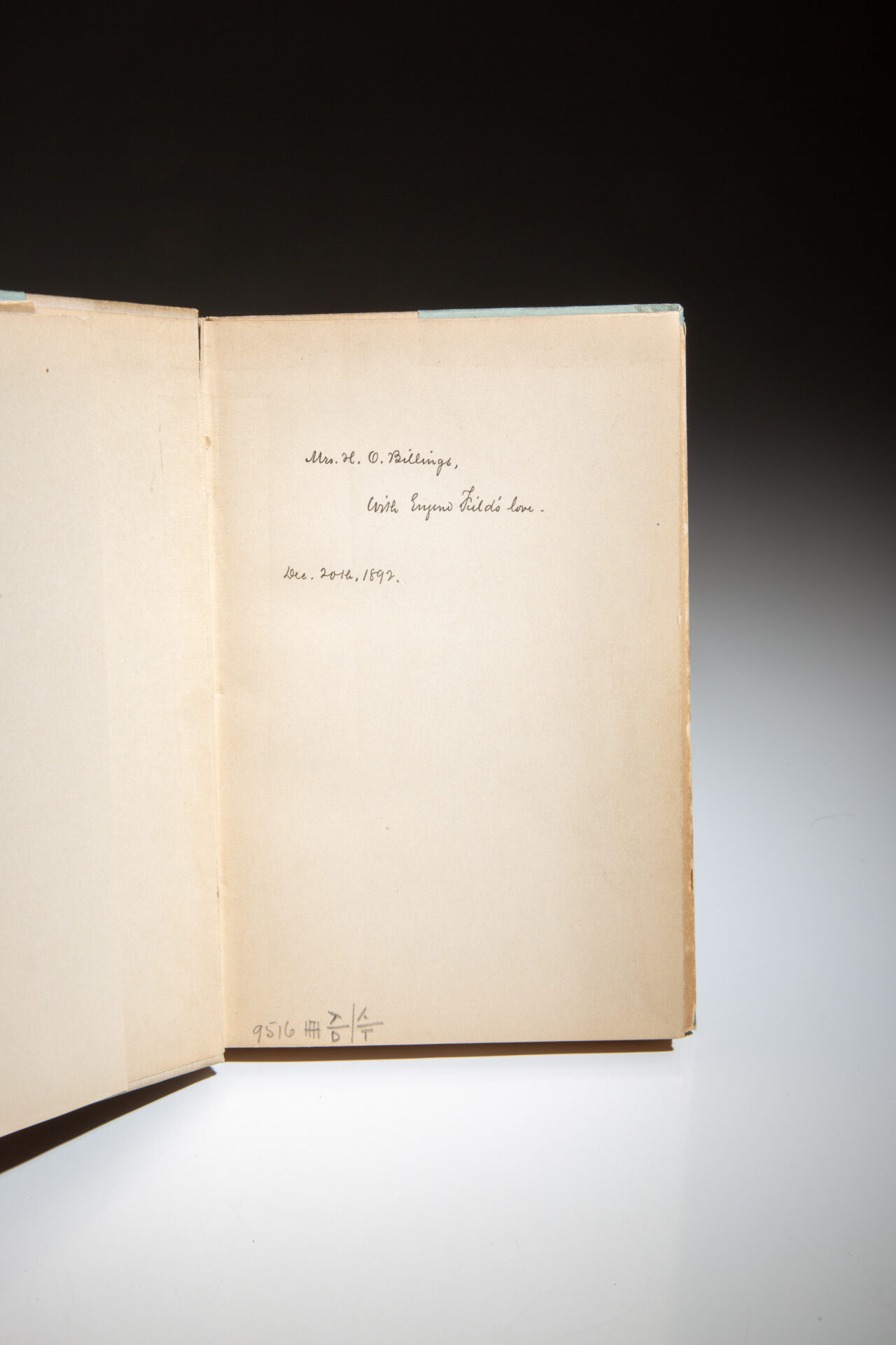 Inscribed by the author on the front free endpaper: “Mrs. H.O. Billings, With Eugene Field’s love. Dec. 20th, 1892.”