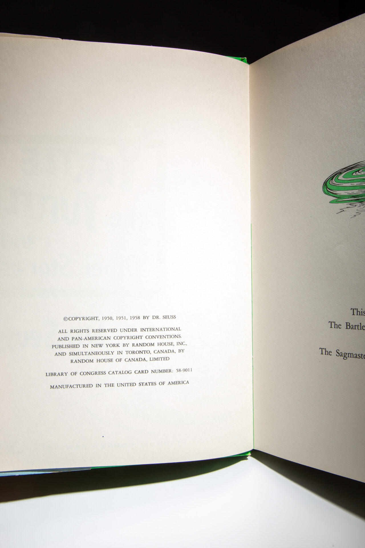 Quarto, [unpaginated]. Glossy paper over boards, title in black on spine. Illustrated endpapers. No additional printings on copyright page. Slight bow to covers, light wear to tips, faint toning to endpapers. A near fine example. Previous ownership inscription on front free endpaper. In the publisher’s first state dust jacket, 295/295 retail price on front flap, light wear to edges with short closed tears, light shelf wear. The first state, with all fourteen correct Seuss book covers shown on rear panel, including Mulberry Street in the top left, and the Grinch on the bottom right.