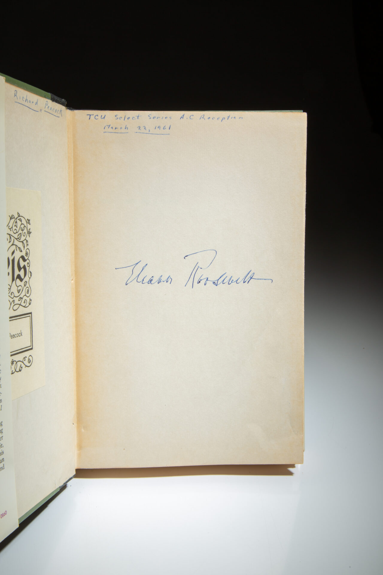 Octavo, xii, 211pp. Green cloth boards, title stamped in gold and silver on spine over black cloth. Stated “First Edition” on copyright page with “G-K” code below. Bookplate affixed to the front pastedown. Small paper puncture along front hinge. Tape remnant to rear pastedown. Handwritten note on front free endpaper, noting this copy was signed by the author at the “TCU Select Series Reception” on March 22, 1961. In the publisher’s first state dust jacket, $3.95 on front flap, faint soiling to white panels, a bright, near fine example. (Edens B26)